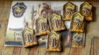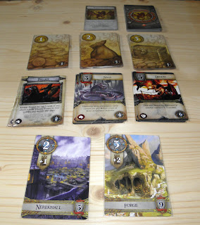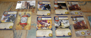 И снова та же рука, что и в начале, но колода "прокачена" аж тремя f! А потому шансы на успешность завоеваний повышаются. 2f завоёвывают очередную крепость, сбросив одно золото и дотянув на руку 1f. который отправляется на завоевание следующей крепости. Ему (а значит и мне) сопутствует удача, ещё один f проделывает путь колода->рука->стол, попутно сбросив 1 золото. Далее за два влияния беру