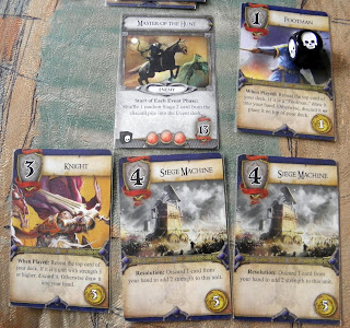 Knight по своей способности доберёт карту на руку (так как нет других воинов силой 3 или выше). Беспроигрышное вложение (тем более, что f в запасах больше не осталось). Прикинув, что вышедшие три g оставляют высокие шансы на то, что f сыграют, нападаю на