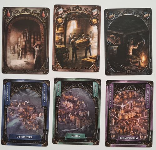 На игровом поле располагаются города со слотами под определенные постройки. Города могут соединяться друг с другом каналами или железными дорогами. Справа находится рынок угля и железа - основных игровых ресурсов. Слева на бочках - очередность хода игроков. Также у каждого игрока есть планшет с жетонами построек. А механизм выбора действий в игре реализован при помощи колоды карт, где каждая из которых представляет собой город или тип предприятия. Например, разыгрывая карту города, вы можете построить предприятие в этом городе, а разыгрывая карту предприятия - вы можете построить предприятие этого типа в любом городе на карте, учитывая, что этот город является частью вашей транспортной сети. Победные очки вы зарабатываете, когда строите дороги возле других предприятий или же продавая оные. Чтобы продать предприятие, необходим проложенный маршрут до точки, где такие предприятия покупают и, на удивление, пиво. Пиво, вообще, достаточно странный ресурс в плане увязывания его с механикой, но я прощаю ему эту оплошность - это же пиво.