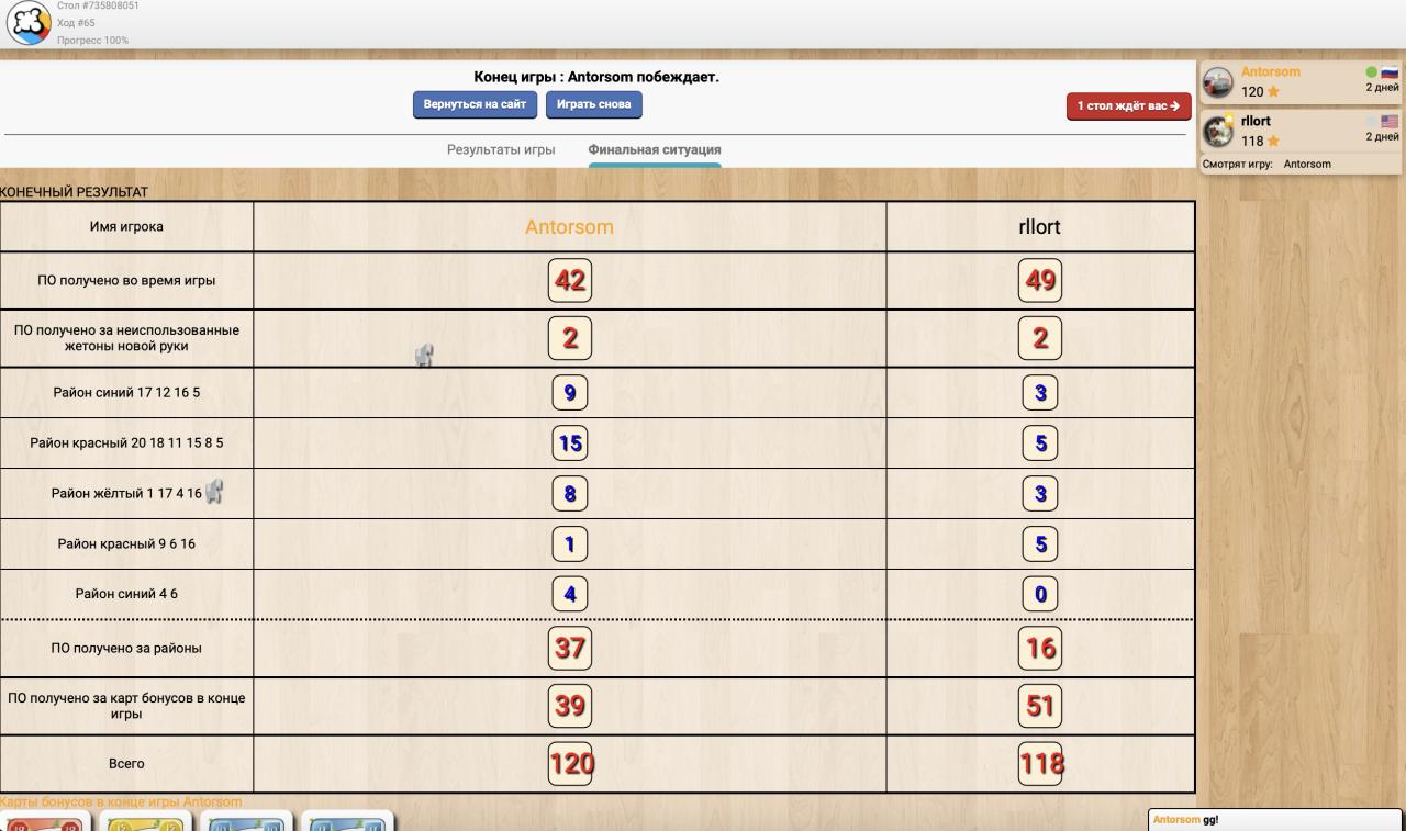 А в конце получим очки за разыгранные карты бонусов (описано выше),за доминирование в районах и честнонаграбленное (возможнозарабтанное) во время строительства и урбанизации. Количество итоговых очков варьируется от длины партии и вовремя вышедших карт на получение ПО при выполнении действия. Всегда нужно понимать, что любая конусная карта может достаться как тебе, так и противнику. Так же за игру можно сделать свободным действием 2 муллигана (сбросить руку, добрать 4 новых карты и потерять 2 очка вконце игры).
