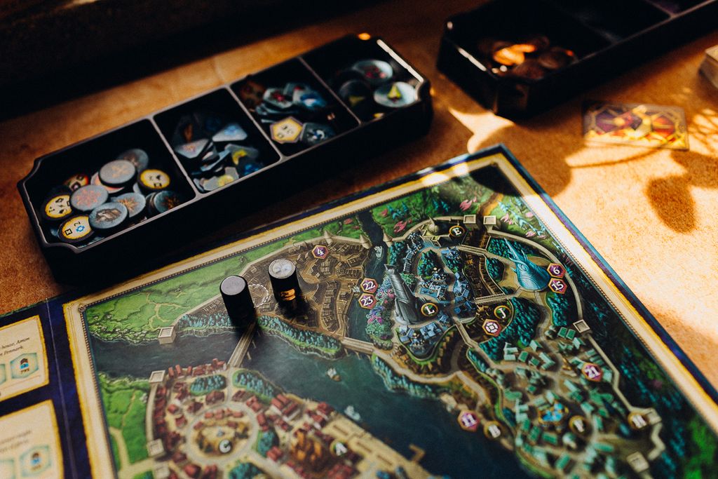 Все карточки сюжета и событий проиллюстрированны, причем превосходными иллюстрациями. Также не могу не отметить, что жетоны предметов такого же размера, как и монеты номинала, за который их можно продать. Вроде и мелочь, но продуманная. И она облегчает игру, равно как и органайзер.