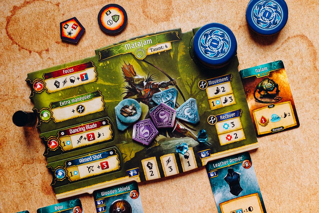 Разумеется, чем сильнее действие, тем оно дороже. Здоровье игроков отслеживается стеками из двусторонних фишек выносливости/здоровья. Для использования мощного действия надо потратить определенное кол-во этих фишек, убрав их из вашего стека. А поскольку фишки служат одновременно здоровьем, если вы получите слишком много урона до того как походите в порядке своей иниативы, возможно, у вас уже не хватит выносливости на выбранное действие. И это еще один фактор, который приходится учитывать при выборе действий в начале раунда.