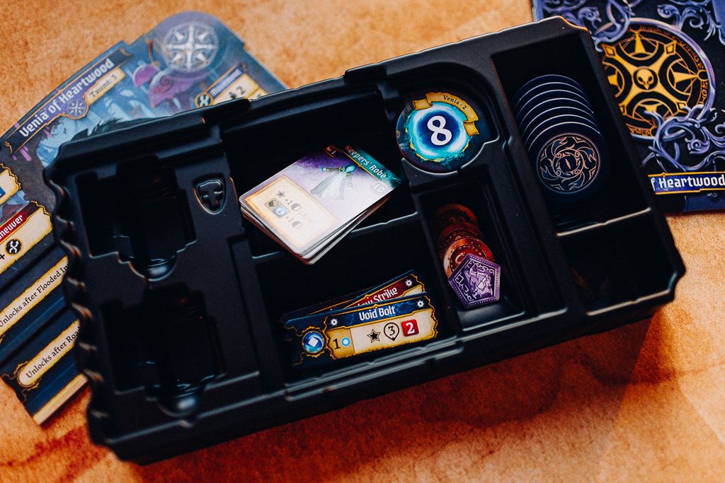 Встроенная система хранения компонентов очень удобная. Здорово, что авторы озаботились тем, как все это будет храниться и раскладываться. Куча треев для жетонов, стэндиков, карточек и для каждого персонажа, чтобы хранить там его данные в промежутках между партиями. Пусть нам не пришлось ни разу складывать игру, но это все равно классно.