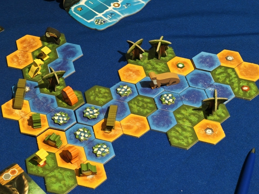 Место на столе. Вот здесь, конечно, проблемка. Даже на двоих игра занимает достаточно много места. А все из-за водопада и рынка. На рынке лежат фрагменты местности, карты окружения и насекомых, а также ресурсы. Плюс, каждый игрок расширяет свой остров, а острова получаются немаленькие под конец игры. Так что готовьте стол побольше.