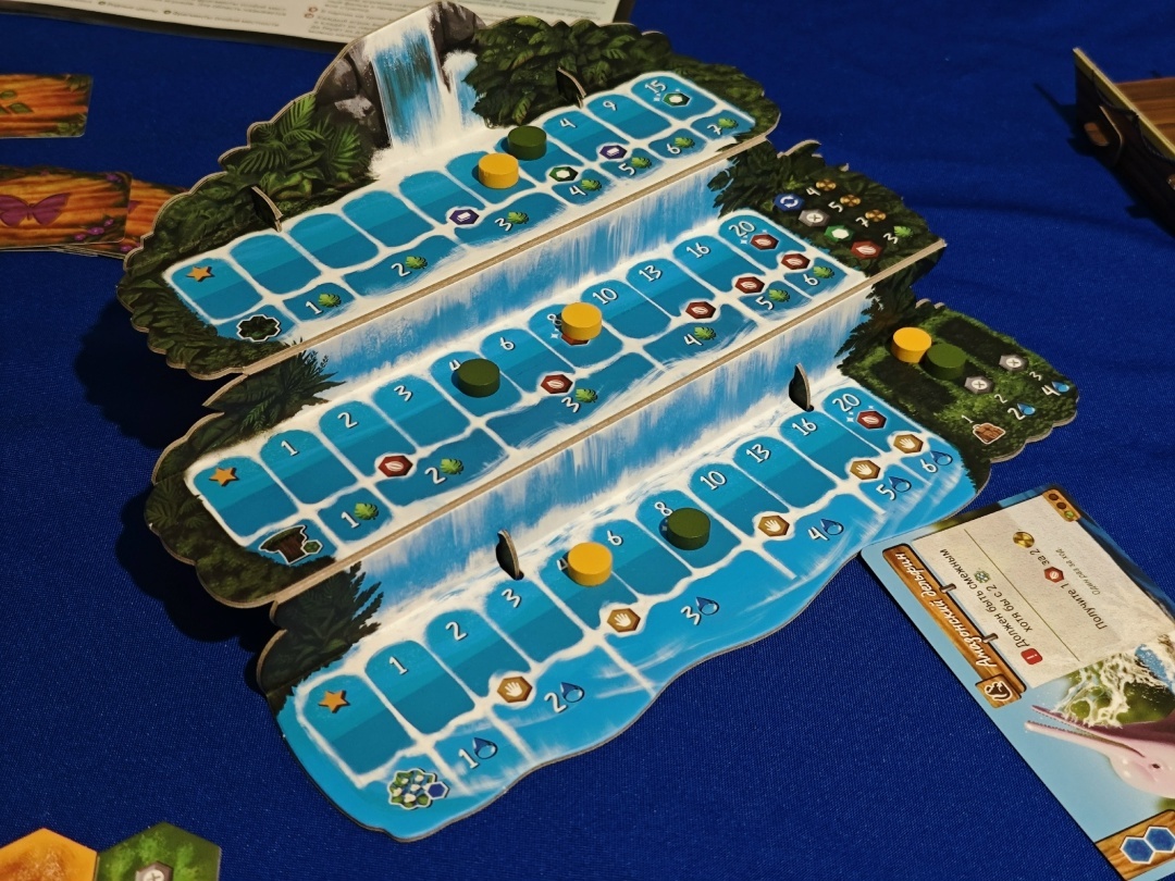 P.S. В игре есть водопад, на котором расположены три шкалы: местность, деревья и цветы. Чтобы совершить первые три действия, игрок продвигается по одной из этих шкал. Если он попадает на клетку с бонусом, он немедленно его получает. В конце игры игроки также получают ПО в зависимости от положения их фишек на шкалах.