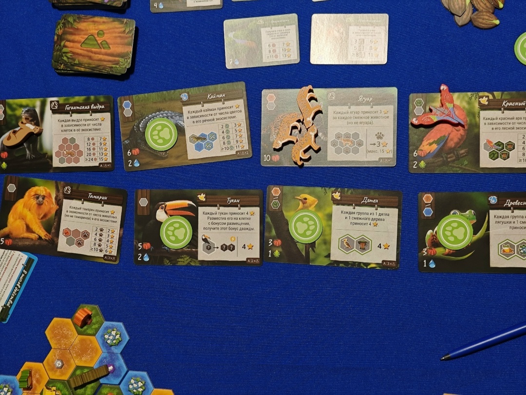 Во-первых, хотелось бы отметить оформление и продакшн. Оформление здесь просто на высоте. Все очень красиво нарисовано. Как я говорил, одно животное может давать разные способы получения ПО, и даже на каждой карте животные нарисованы по-разному. Сразу видно, художники прорабатывали каждую мелочь. Продакшн тоже на высоте: вы только посмотрите на этот водопад и рынок жетонов. Рынок, кстати, закрывается и удобно кладется в коробку. Все животные выполнены из дерева со своими артами. Очень круто. Единственное, это то, что водопад довольно проблематично собирать и разбирать, а в коробку он не помещается. Поэтому он красуется у меня на шкафу в собранном виде.