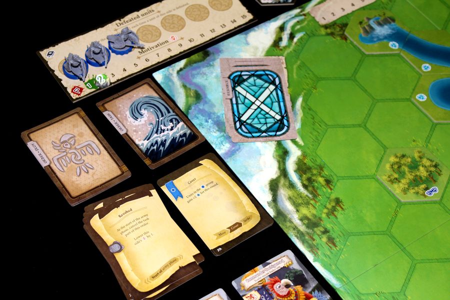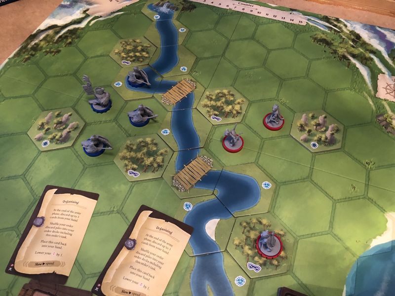 Центральной механикой в игре стало ожидание. Короче, в каждом сценарии было несколько способов его закончить или победить. Наиболее частым условием наступления временного мира было одновременное отступление обеих сторон. Чтобы это произошло, нам, с помощью приходящих на руку карт нужно было контролировать действия всех сторон, чтобы потери с обеих сторон были примерно пропорциональны и чтобы боевой дух у всех сторон падал примерно одинаково. Потери были в каждом сценарии. Ну и в большинстве случаев первые несколько ходов действительно ничего делать было не нужно — нужно было просто тянуть карты действий всех участников битвы и ждать, пока не произойдет какой-то переломный момент, чтобы дальше уже совместно балансить потери.