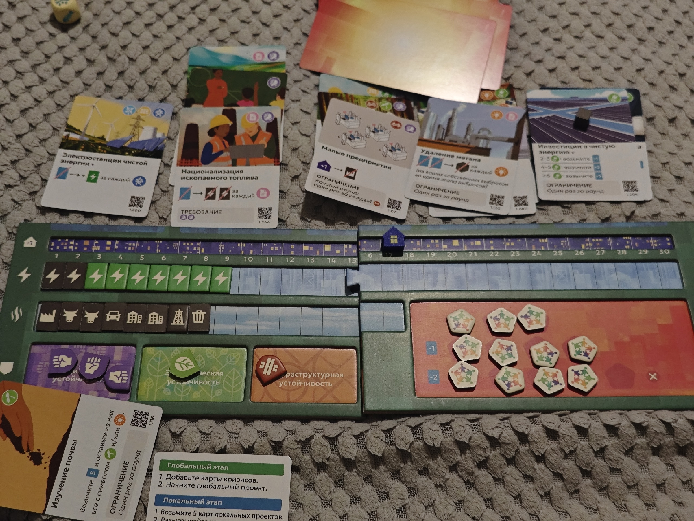 Игрокам в роли одной из мировых держав предстоит сплотиться и вплотную заняться снижением производства вредных выхлопов в атмосферу. Они будут запускать локальные и глобальные проекты, которые им в этом помогут. Но не все так просто, ведь каждый раунд на Земле случаются кризисы и катастрофы, что существенно замедлит прогресс игроков. Более подробно все распишу в обзоре, а сейчас кратко по правилам.