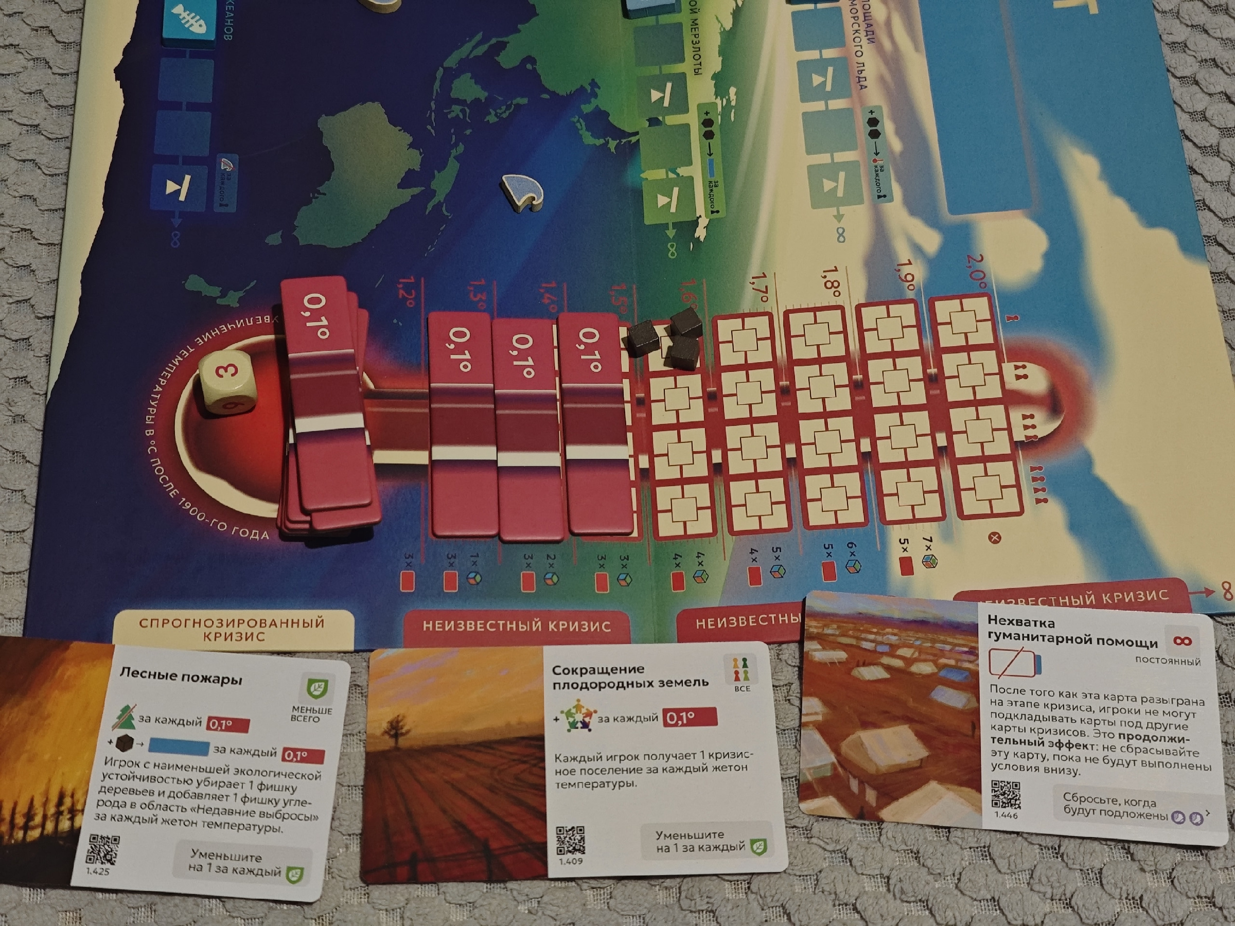 Затем игроки разыгрывают карты кризисов. В начале раунда выкладываются три кризиса (количество увеличится при потеплении). Один из них известен, остальные лежат в закрытую. Вам необходимо пережить их все. Эффекты многих кризисов можно ослаблять при помощи различных карт и наличии жетонов устойчивости в различных сферах.