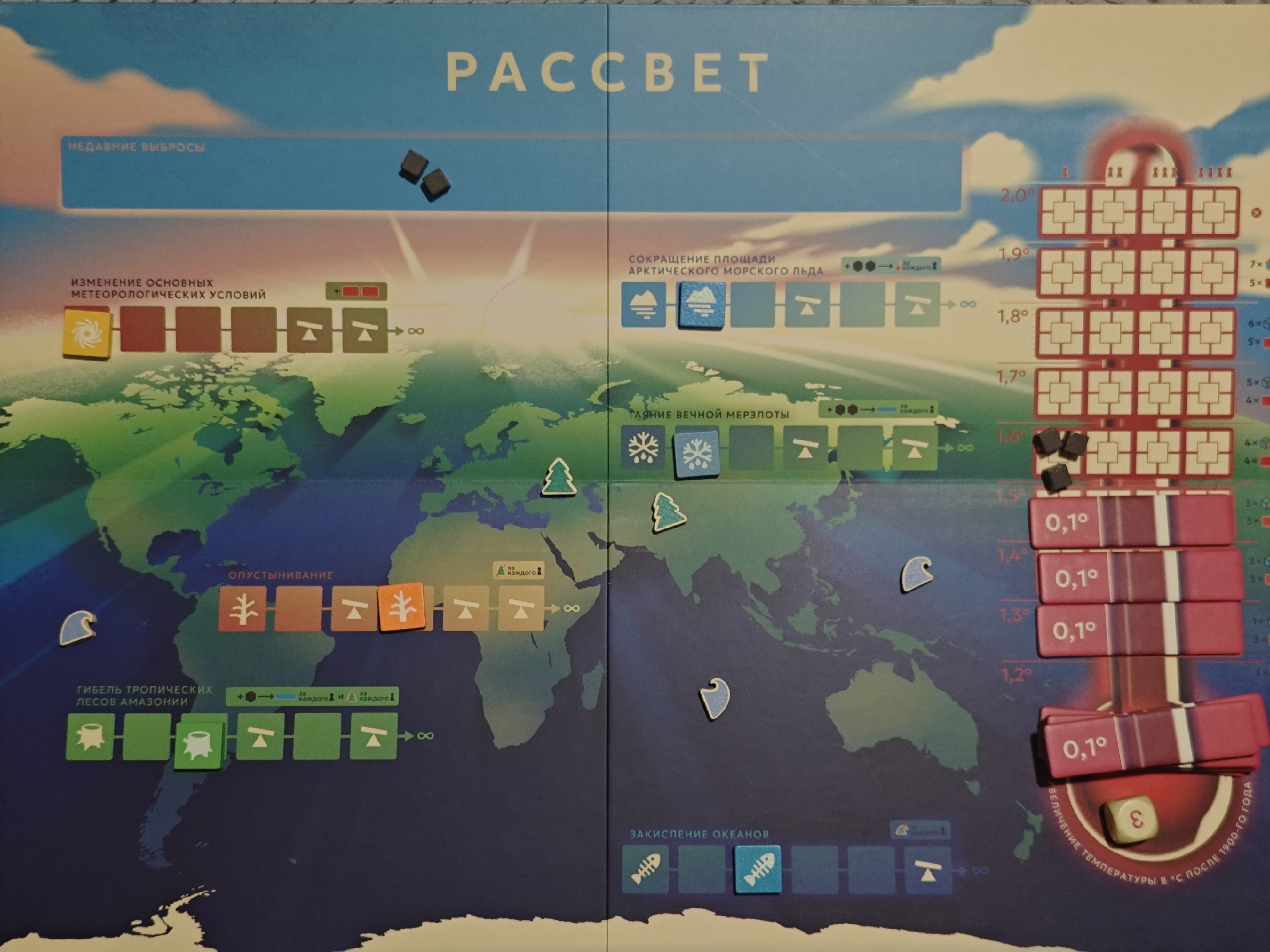 Как только все игроки совершили действия, вы считаете произведенные выхлопы и смотрите, сколько смогла переработать природа. Если переработано все, переверните жетон раунда на сторону "Сокращение". Если нет, то все излишки переходят на шкалу температуры. Если один ряд полностью заполняется, выкладывается жетон температуры "+0.1 градус".