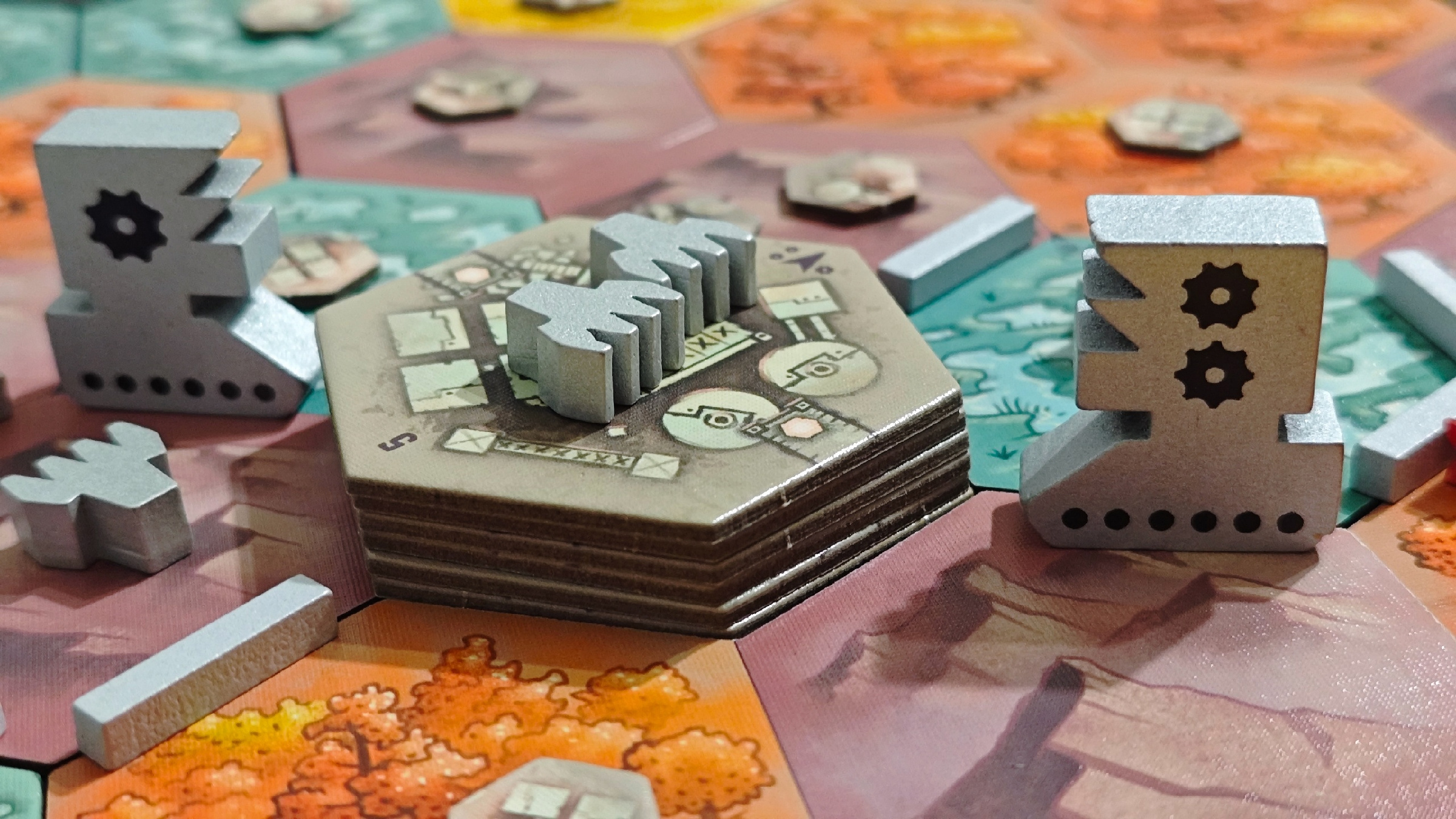 В центре собирается поле из гексов. Оно модульное, то есть каждый раз поле будет выглядеть по-разному. В центре выставляется машинное ядро, а также все фабрики. На определенных гексах выставляются первые роботы-механиды и жетоны загрязнения. Также на поле выставляются две бронемашины, которые будут строить стены и плодить новых механидов.