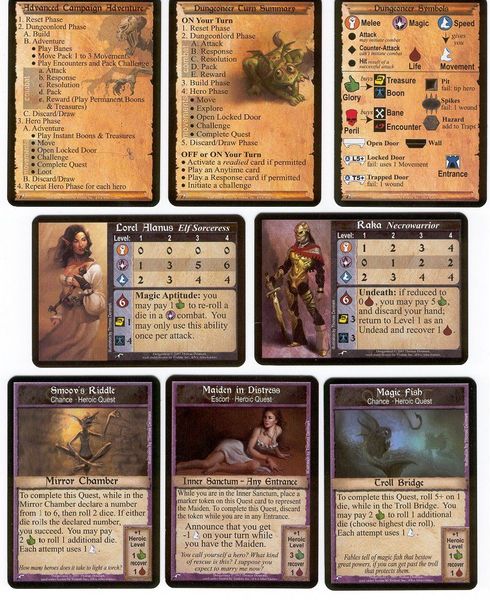 Каждый начинает со своим героем, 2 картами заданий и 5 картами приключений на руках. В начале хода вы берет на себя роль хозяина подземелья и начинаете строить подземелье (вытягивая из колоды новую карту локации и кладя ее по соседству с уже имеющимися). Затем играете карты риска из руки (т.е. монстров, ловушки, неприятные события и т.п.) на героев других игроков. После чего вы передвигаете своего героя, исследуете местность, играете карты славы (т.е. сокровища, дополнительные преимущества, заклинания и положительные события) на своего героя и стараетесь выполнить указанные на картах ваших заданий условия. Стоит отметить, что для победы надо выполнить 3 задания, а начинаете вы с 2. Третье задание - не личное, а общедоступное, лежащее у всех на виду со старта. Любой может попытаться его выполнить; в случае успеха из колоды вытягивается новое. Таким образом, для победы придется выполнить как минимум одно общедоступное задание, за которое наверняка будет конкуренция.
