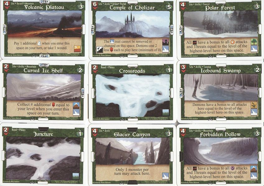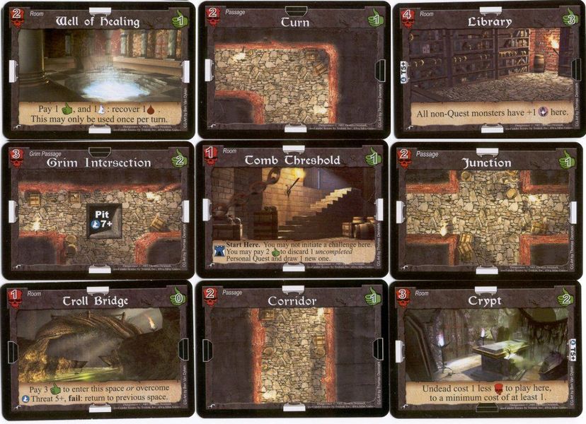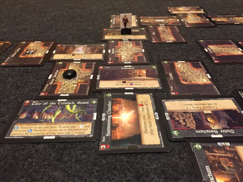 Карта генерируется выкладыванием наподобие тайлов карт локаций. Поэтому, во-первых, каждую партию создается новая карта, во-вторых, подземелье может измениться прямо в ходе игры. Некоторые карты приключений меняют местами карты локаций, передвигают их в другое место и т.д. Нет ничего приятнее, чем засунуть в самый дальний угол очень важную для вашего конкурента локацию, когда его герою осталось до нее один-два шага.
