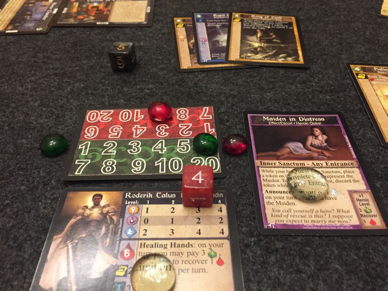 В конце хода вы сбрасываете с руки одну карту с руки, добираете карты приключений, чтобы в сумме их на руке оставалось 5, а затем наступает ход следующего игрока.