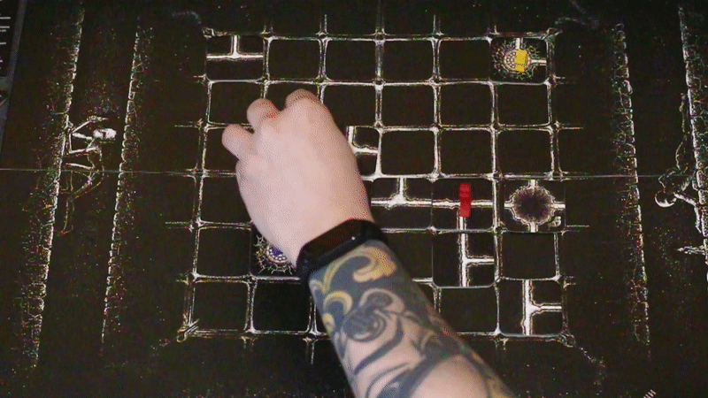 🟢 Переместиться. Перемещение происходит на 1 клетку в любую сторону. При этом игрок начинает освещать новые клетки, а старые, на которые не попадает свет, уходят в сброс. У свечи каждого игрока дальность освещения равна одной клетке по направлению любого прохода.