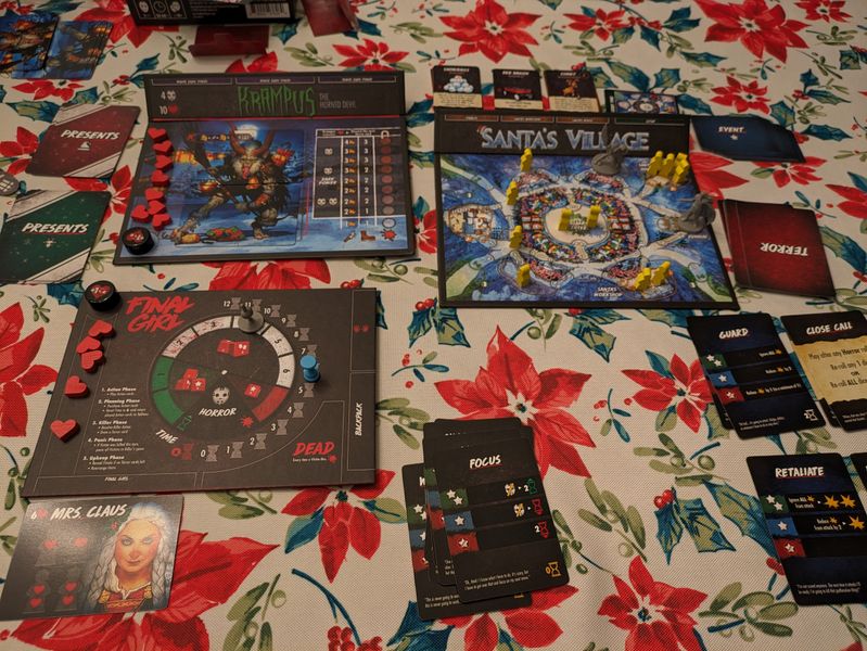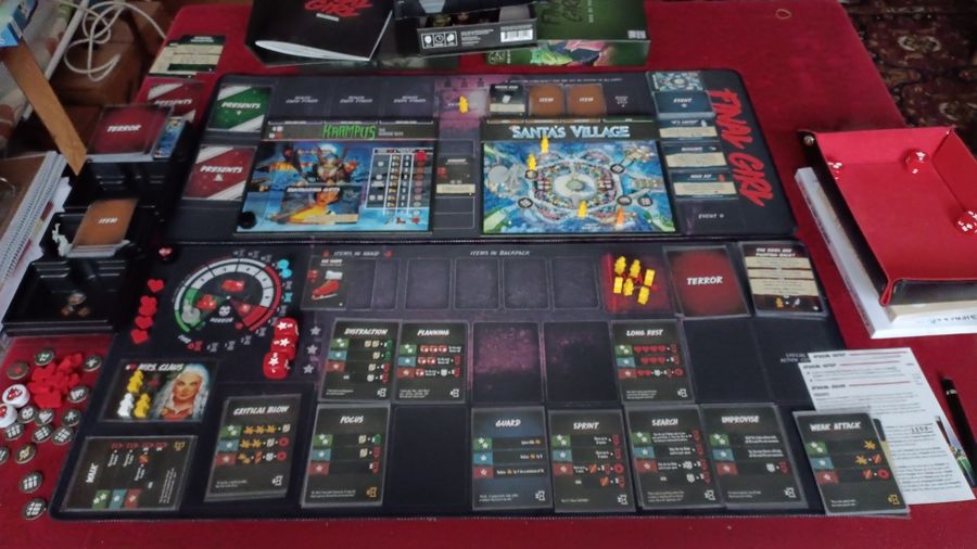 Не уверен, мне ли так не везет, или игра действительно сложная, но победить в этом допе оказалось очень нелегко. Обычно мой винрейт в серии Final Girl около 50%, при том, что я играю в основном на максимальной сложности. Но в этом допе я всегда выбираю самую низкую сложность, и все равно проиграю. Возможно, дело все же в невезении. Как я уже упоминал, мне довелось подобрать лишь один подарок Санты, и как раз в той партии удалось еле-еле выцарапать победу. А обычно все идет по закону Мерфи: эльф переворачивает очередной жетон подарка, я думаю что там подарок Санты, и обычно так оно и есть. Я переворачиваю жетон подарка - бац, "подарок" Крампуса. Вот черт!