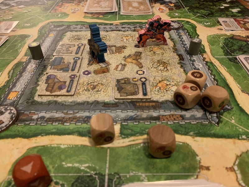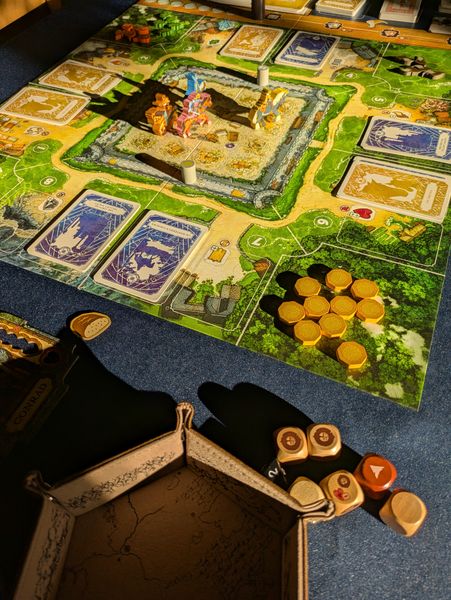 Часть для тех, кто боится, что игра одноразовая. Вспоминая о целевой аудитории – дети дошкольного и младшего школьного возраста – работает магия повторения. Любимые сказки приятно снова слушать перед сном. А тут можно не только слушать, но и играть! Помимо основной миссии – летописи, к ней выбирается карта большого задания, которых в игре отдельная стопка из 3-х категорий сложности. Все они сводятся к разным комбинациям одних и тех же задач на зачистку секторов, сбор ресурсов, продвижения по шкалам благополучия или боеготовности, постройки определенных зданий в крепости и т.д., но здорово обыграны небольшим текстовым прологом.