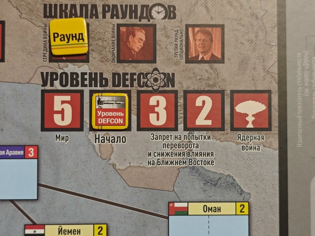 DEFCON - это шкала, отображающая близость к ядерному конфликту в игре. Маркер двигается вправо за попытки переворота в ключевых странах. Если один из игроков доведет маркер до последнего деления, он начинает ядерную войну и автоматически проигрывает.