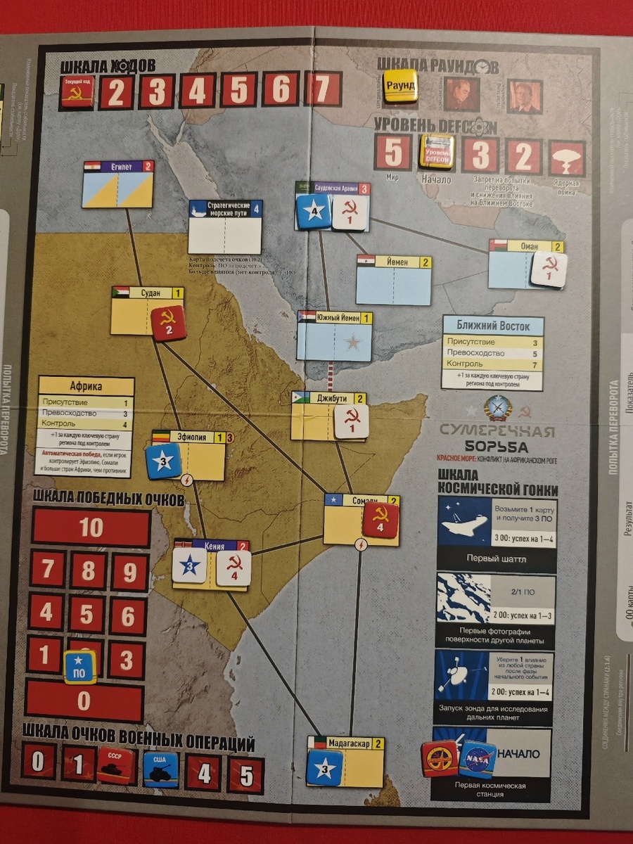 Сумеречная борьба. Красное море - это настольная игра, правила которой на 95% совпадают с ее предшественницей. СССР и США все также сражаются за господство в регионах, расширяя свое влияние и устраивая перевороты. Но в игре теперь всего два региона: Африка и Ближний восток. Красное море охватывает лишь середину и конец войны и длится два раунда вместо десяти.