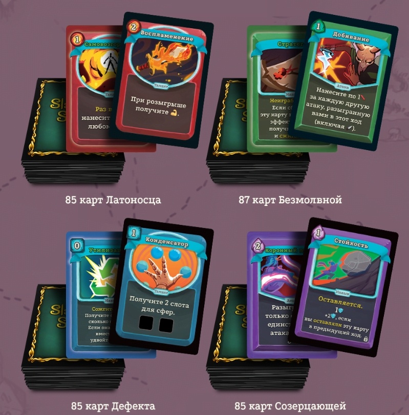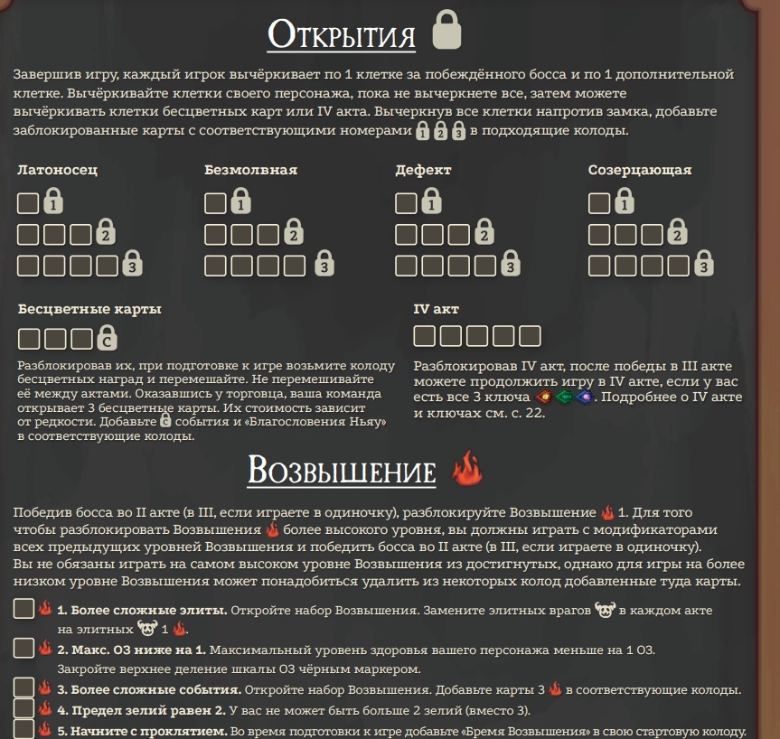 В игре есть открываемый контент, каждый раз проходя забег и побеждая боссов вы вычеркиваете окошки в правилах(или просто отмечаете в приложении на телефоне) напротив своего персонажа, а затем добавляете новые карты в колоду персонажа. Ксюша все партии играет за латника, а я пробую новых, поэтому у нас пока что только Латник открыл все свои карты. Дальше сможем уже вычеркивать окошки для Бесцветных карт и тоже добавим в игру.