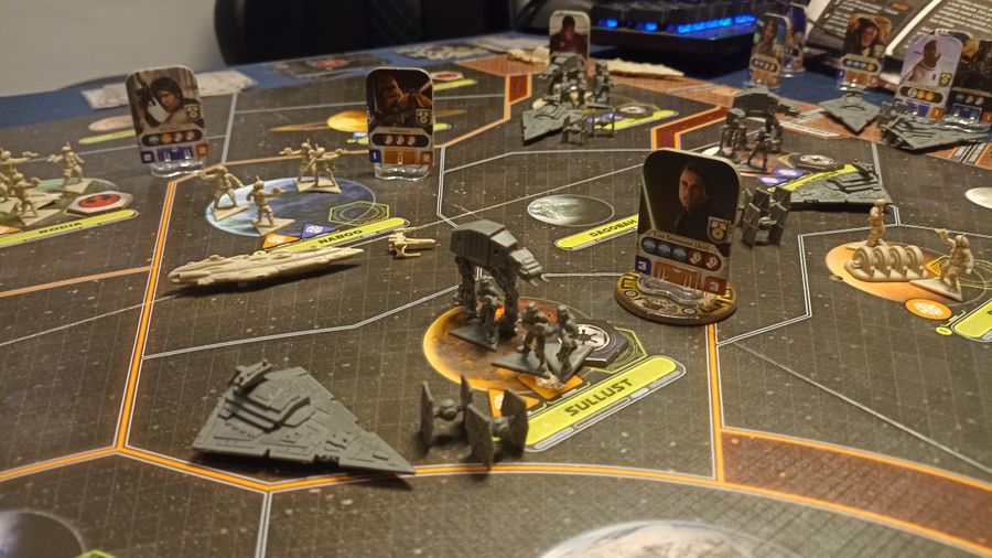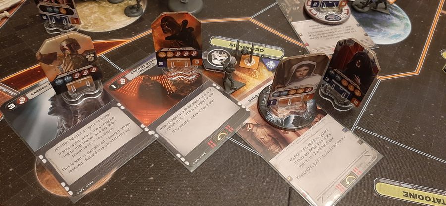 Об игре очень много писали, поэтому я не буду особо останавливаться на правилах, а скажу только, что они крайне просты: в свой ход игрок может назначить лидера на выполнение миссии; выставить лидера в какую-либо систему, чтобы переместить туда войска. Кроме этого можно назначить своего лидера для попытки противостоять врагу в исполнении его планов. Такая нехитрая, на первый взгляд, механика позволила автору (а это не кто иной, как Кори Конечка/Конеска) создать уникальную и потрясающую по своей глубине настолку. И стоит остановиться именно на тех моментах, которые создают непередаваемую атмосферу противостояния темной и светлой сторон силы.