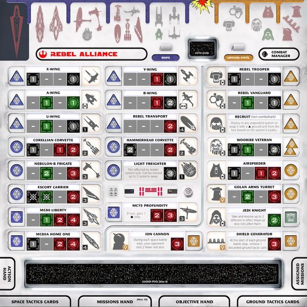 В-четвертых, в игре множество минек, которые хотя и не так масштабны, как в выходящем сейчас «Легионе», все же вполне узнаваемы. И очень здорово, что все свойства наших отрядов автор смог систематизировать и уместить на одном планшете, так что не нужно каждый раз листать правила или перебирать карты, чтобы увидеть, кто и как атакует и сколько у кого единиц жизни. Разнообразие боевых единиц также потребует размышлений, как их распределить, ведь пополнение армии происходит только в определенные раунды и на тех планетах, которые подчинены соответствующей стороне (так что иногда бывает выгодно ослабить врага диверсией, а не в сражении). При этом большие корабли, как и положено, требуют больше времени на производство, чем другие юниты.