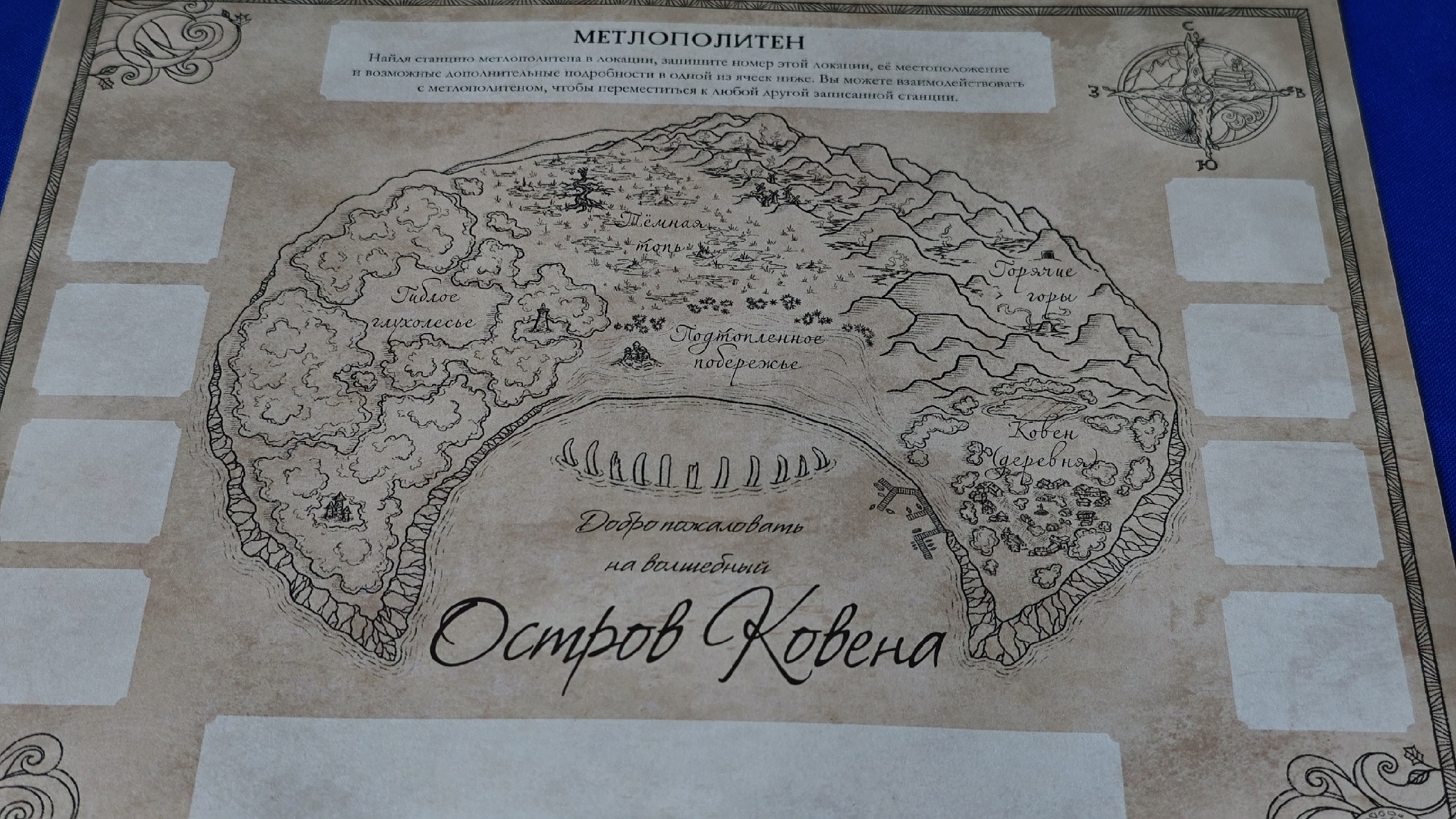 Помимо этого у вас будет лист персонажа со всеми характеристиками и инвентарем, а также карта острова. На листе персонажа вы будете отмечать ваши характеристики, вписывать найденные предметы и ингредиенты, ключевые слова, а также алхимичить. Карта острова вам понадобится, когда вы завершите вторую миссию и вас выпустят из города.