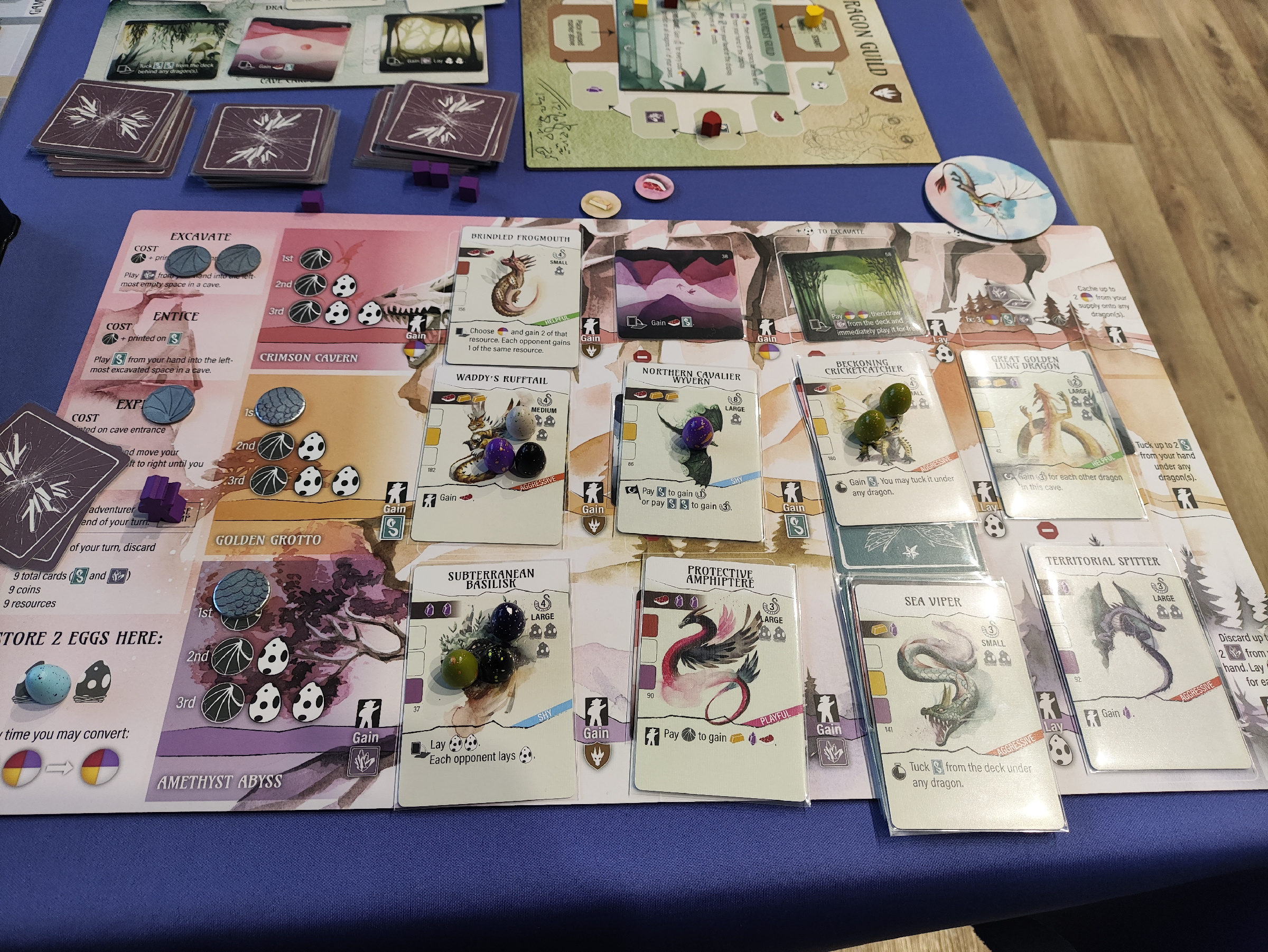 Всё в игре завязано на драконах(ожидаемо), там и спрятан весь не контролируемый рандом игры. Выше я не уточнял, но стоит сказать, что чтобы поселить дракончика на свой замечательный планшет, ты сначала должен построить ему дом, точнее выкопать пещеру, нагло с их стороны, но и понять тоже можно. Пещеру можно сыграть в любой ряд, но конечно, соблюдая правило выкладки слева на право. При выкладывании на планшет, пещера даёт бонусик, чаще всего ресурсы\карты. В пещерах рандом не велик, плюс-минус одно и тоже в разных комбинациях, всегда что-то найдешь на этот или следующий ход. А вот у карт драконов куча разных условий и полезностей в той или иной стадии игры, что и создаёт дикий и местами не справедливый рандом. Каждый дракон живёт на разных рядах, кто-то в первом, кто-то во всех и т.д Есть драконы, которые дают бонус в конце раунда, есть которые дают бонус при активации "исследования" - это когда мипл бежит по определённому ряду и собирает от туда все бонусы, а какие-то драконы работают как цели, проверяешь условия уже в конце партии. + Ещё есть детеныши, которые требуют определенный ресурс(молочко) и обычно дорого стоят для розыгрыша на планшет, но в отличии от обычных драконов, дают сразу несколько эффектов. + у всех драконов есть характеристика(агрессивный,спокойный,игривый и т.д) это нужно для целей.