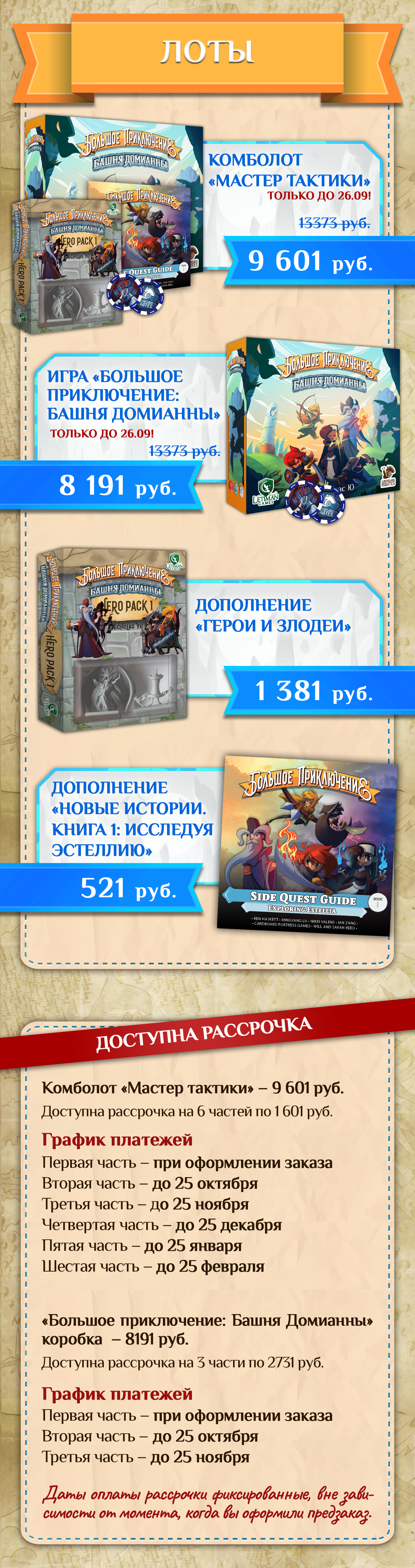 «Большое приключение: Башня Домианны» — это кооперативная сюжетная игра для 1-5 игроков. Босс-баттлер, данжен-кроулер и декбилдер. Да, вот так. Всё, что мы любим, в одной коробке!) В игре вас ждут тактические бои с боссами, каждый из которых обладает уникальным стилем действий и своими подручными; сюжетные решения, которые отражаются на геймплее, и прокачка героев: выбор классов развития, приобретение мощных карт действий и предметов. За одно прохождение игры вы не сможете посмотреть все сюжетные развилки и прокачать все классы — будет отличный повод пройти ещё пару раз!