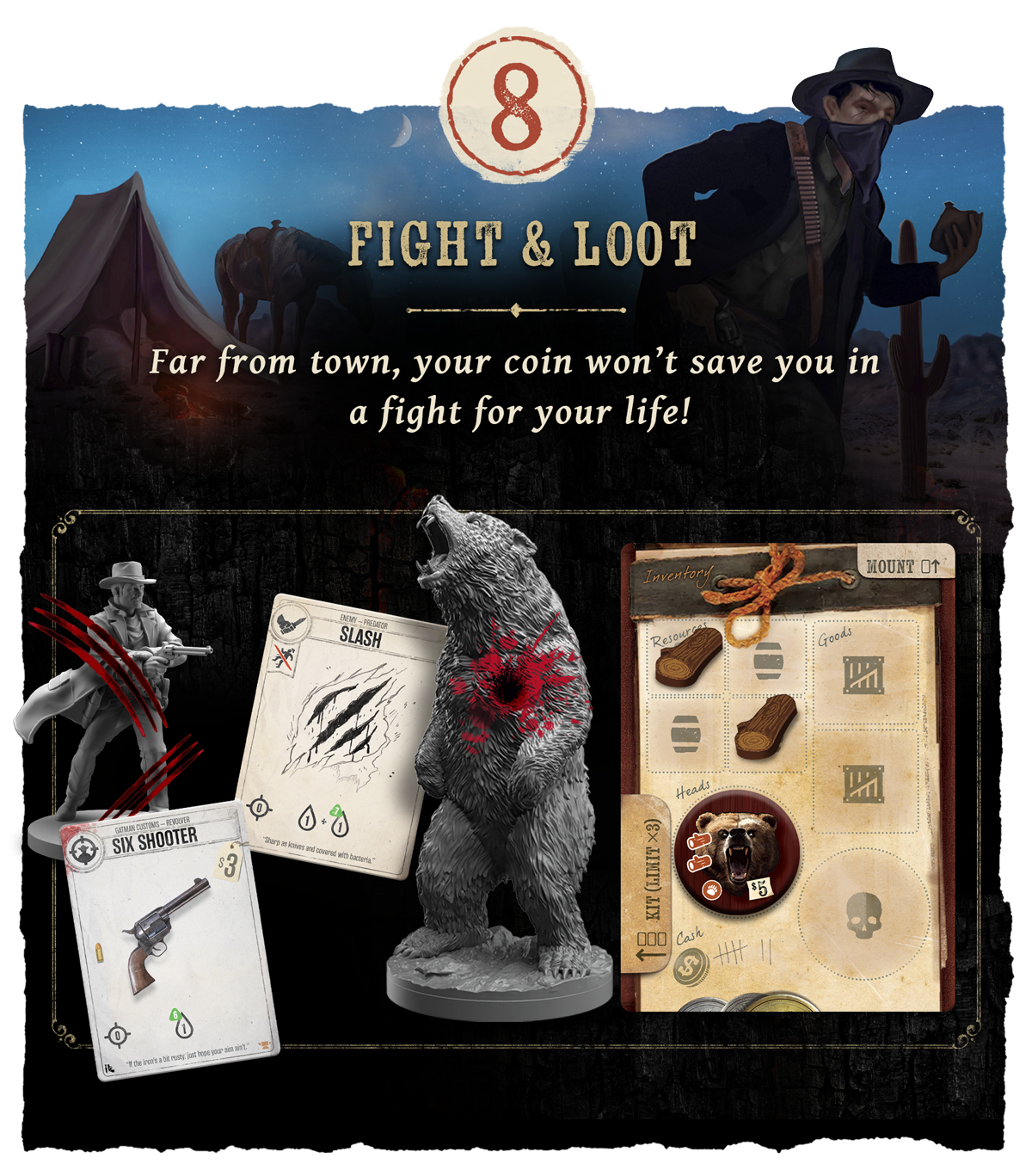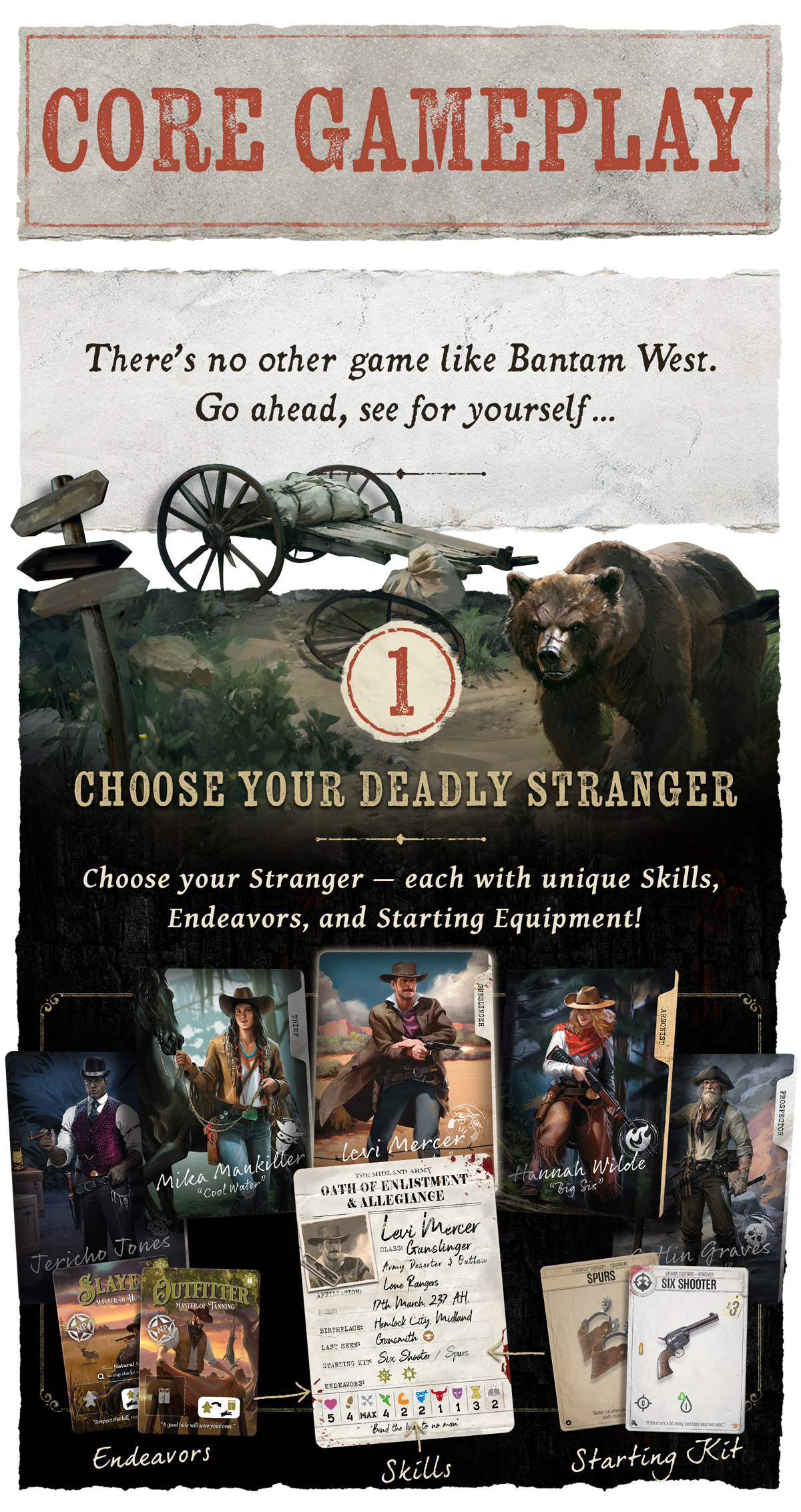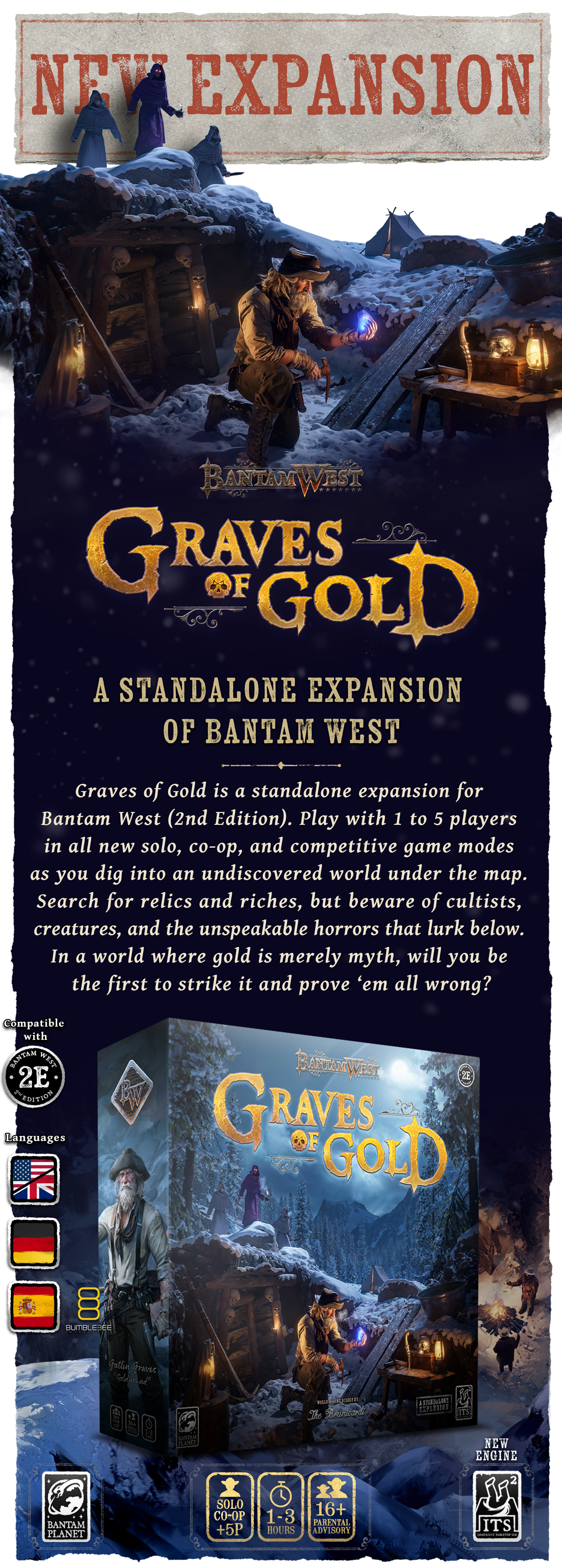 Bantam West (вторая редакция) — это соревновательная игра в стиле вестерн с открытым миром, рассчитанная на 2–4 игроков, которым предстоит оказаться в роли чужака в неприветливых диких землях. Вторая редакция добавляет новое дополнение, а также кооперативный и соло режимы.