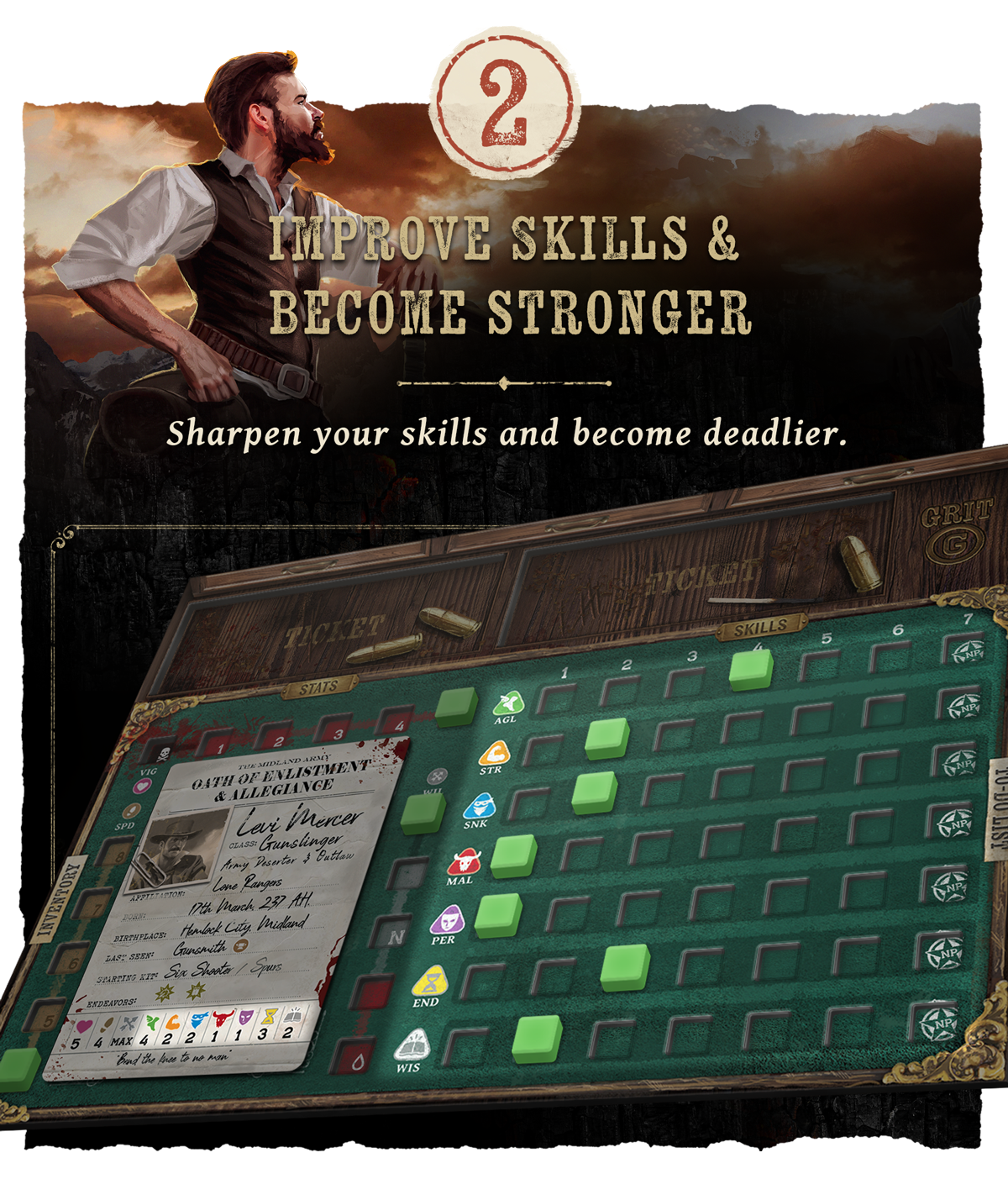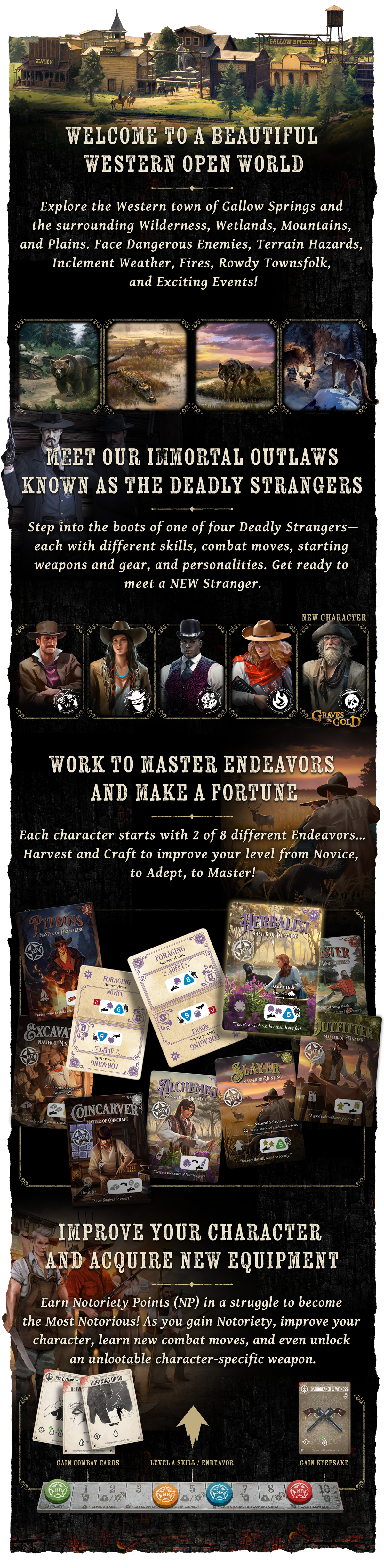 Привет, усталый путник. Ходят слухи, что ты один из тех опасных чужаков, которые не умирают. Я никогда не верил в легенды о людях, которые не боятся ни смерти, ни времени. Но вот ты стоишь передо мной. Неважно, что привело тебя сюда; важно то, что ждет тебя впереди. В конечном счете твое имя будет на устах у всех, но чтобы оставить свой след в этом краю, тебе придется стать самым знаменитым. Присядь, и я расскажу все, что тебе нужно знать об этих диких землях...