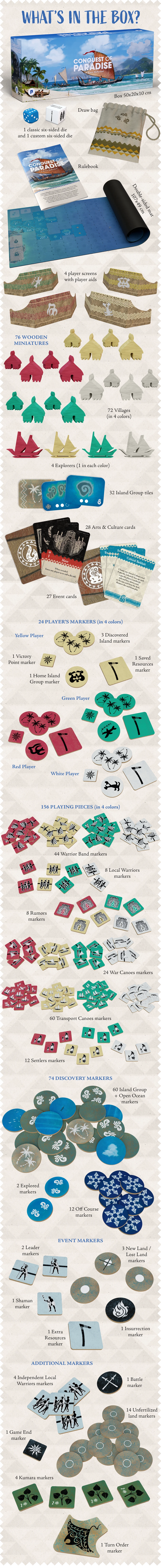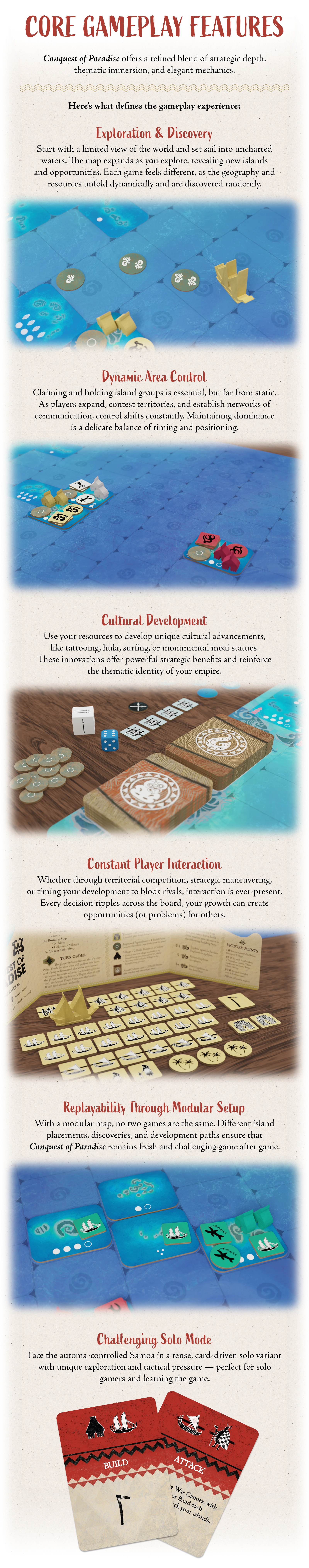 Добро пожаловать в Conquest of Paradise - игру об открытиях, экспансии и амбициях, разворачивающуюся на просторах Полинезийского треугольника. 2-4 игрока управляют народами мореплавателей, путешествуя по неизведанным водам в поисках плодородных островов для заселения, экспансии и обороны.