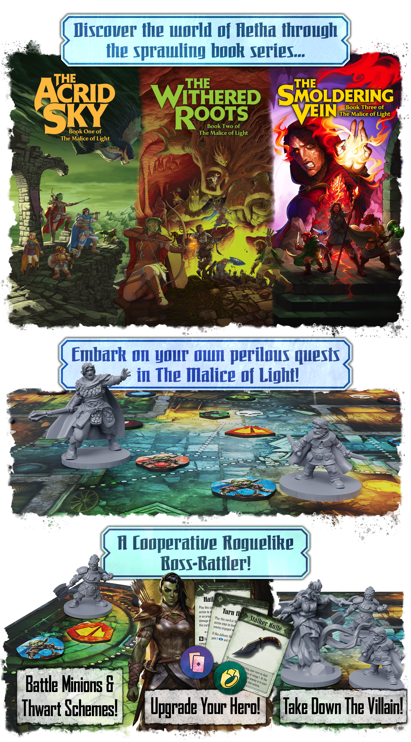 Это босс баттлер в стиле классического фэнтези от авторов Descent-а второй редакции, Warhammer Quest: The Adventure Card Game, Героев Терринота и Street Masters. Основан на эпической серии фэнтезийных книг Брэди Дж. Сэдлера «The Malice of Light».
