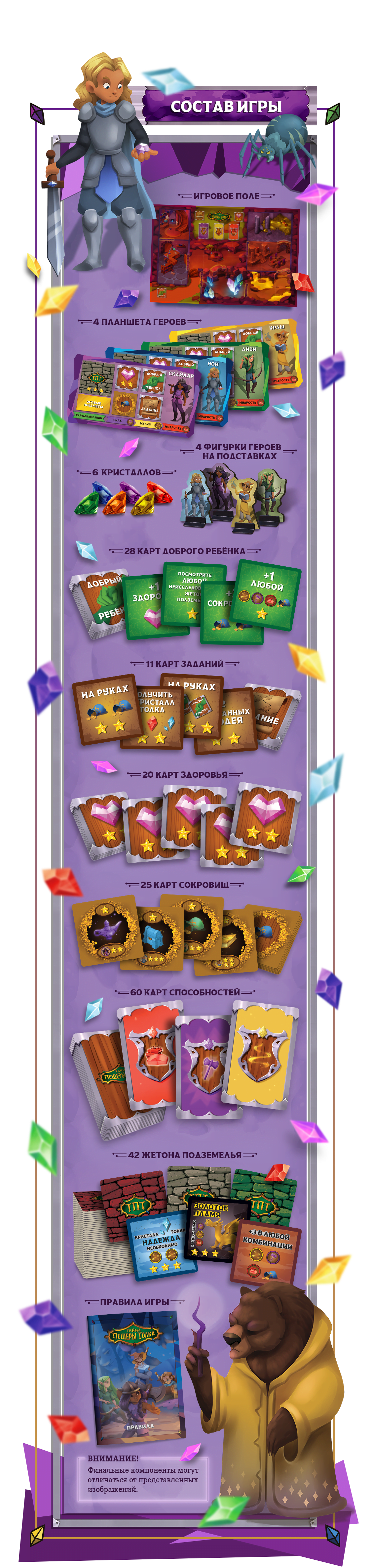 Сила, магия и мудрость – три важных составляющих, которые позволят добывать магические камни и бороться с монстрами. За каждого из них вы получите победные звёзды, которые будут подсчитываться в конце игры. Но это не обычная соревновательная игра, в ней есть и кооперативная составляющая – дети смогут помогать друг другу и получать за это различные полезные бонусы, которые необходимы в течение партии и при финальном подсчёте.