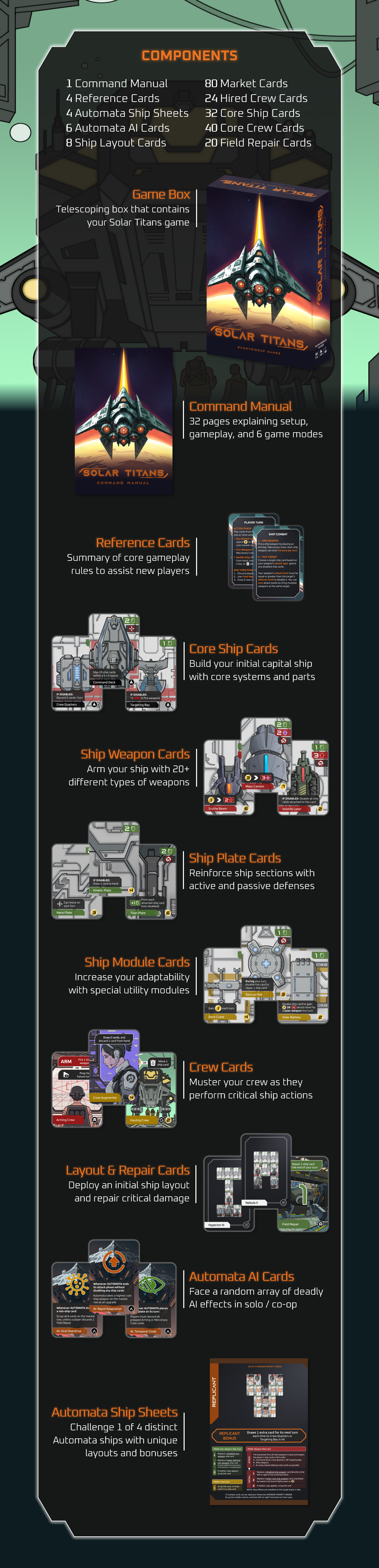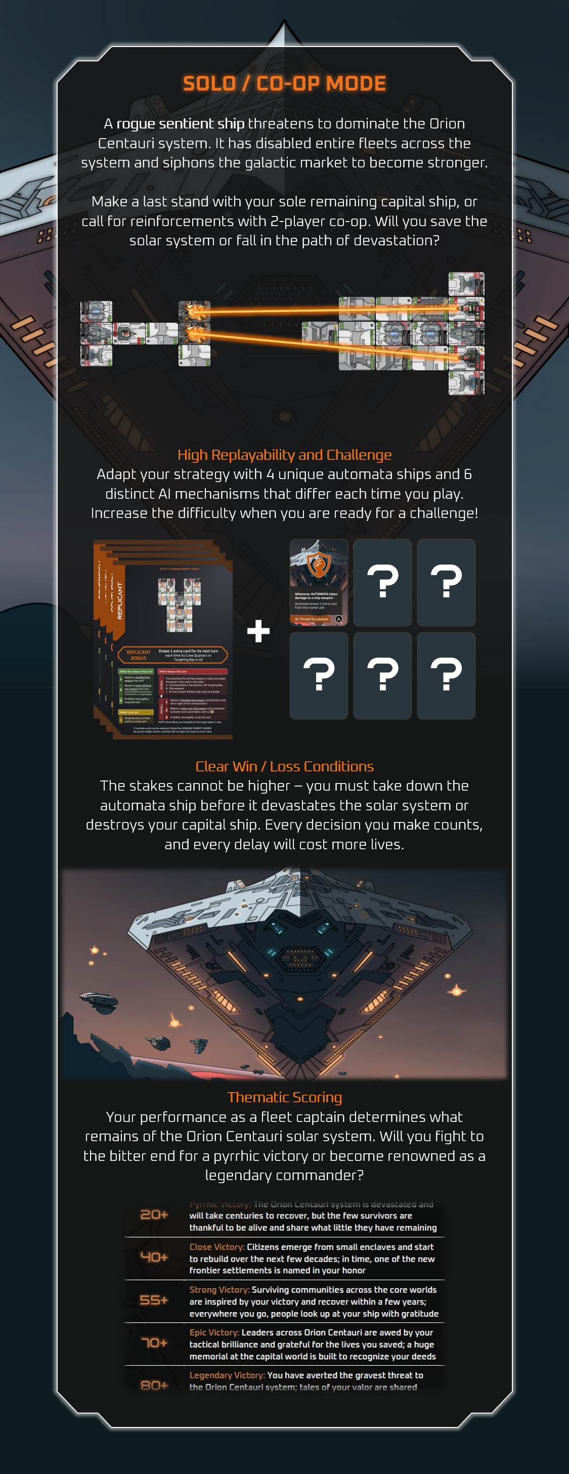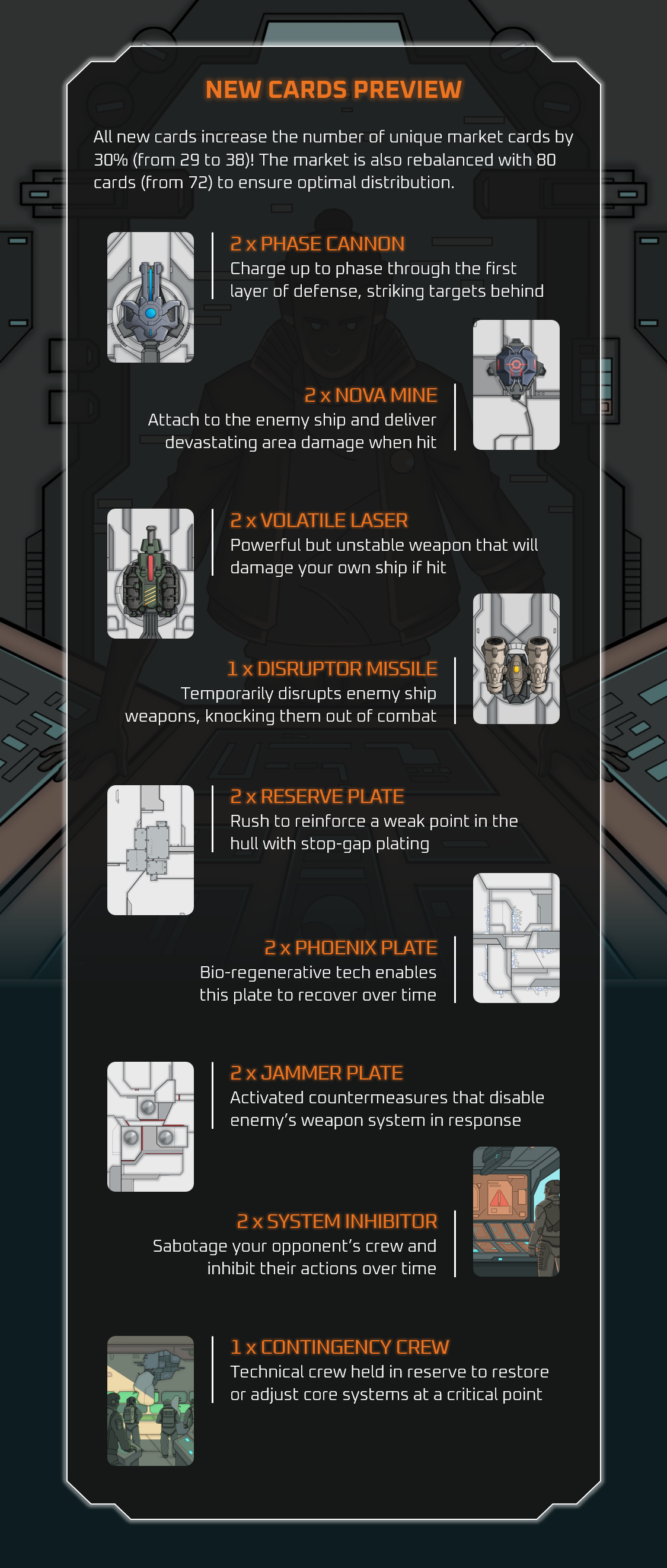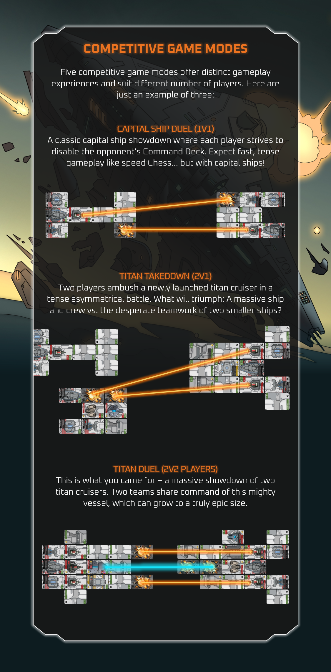 Отстройте заново свой космический корабль, разместите команду, и вступите в напряженный бой, где каждое принятое вами решение имеет значение. Вы начинаете с 1 из 8 макетов кораблей, сформированных с помощью карточек кораблей, которые представляют собой различные модули. Вы должны защищать свою командную палубу любой ценой.