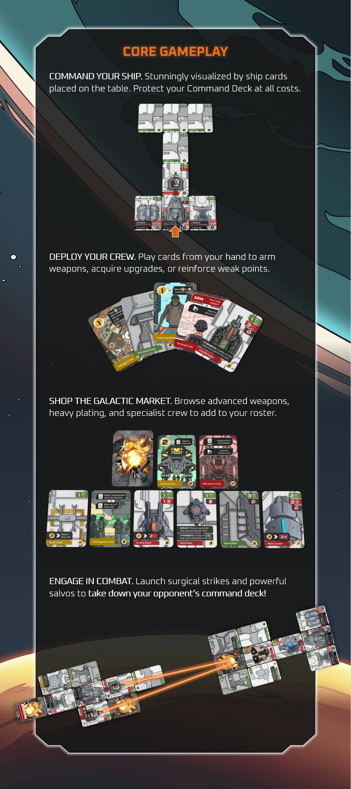 Это карточная стратегия на основе механики построения колоды, которая предлагает захватывающий, динамичный и стратегический бой космических кораблей.