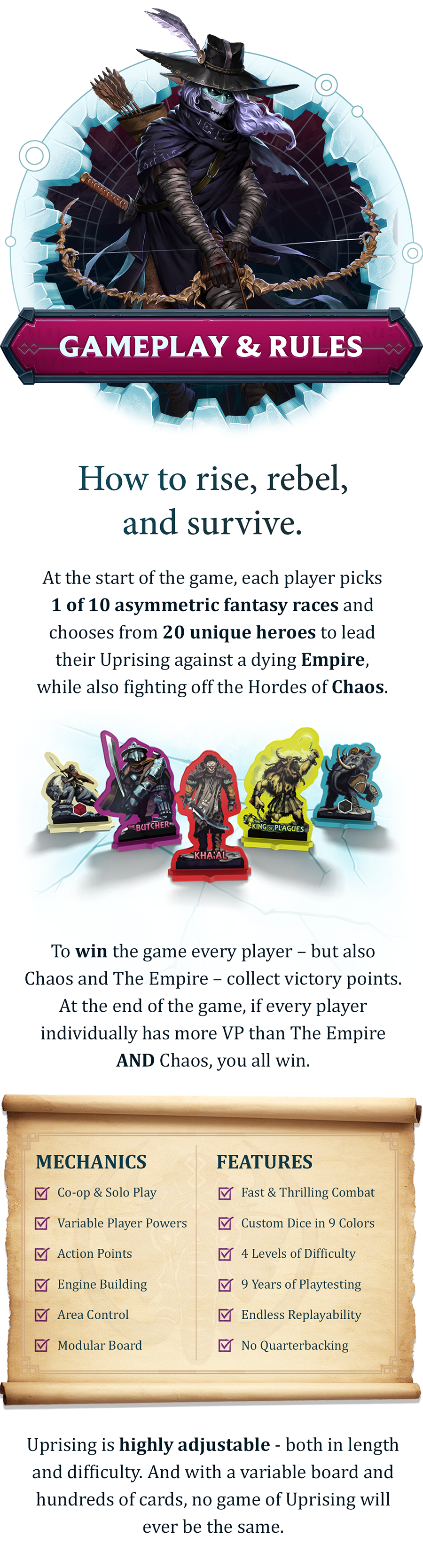 Uprising: Curse of the Last Emperor - это комплексная кооперативная стратегия для 1-4 игроков, которая разворачивается в сеттинге постапакалиптического тёмного фентези. Когда знакомый мир подходит к концу, игроки берут на себя роль великого героя, чтобы возглавить восставшую против тиранической Империи фракцию в эти темные времена.