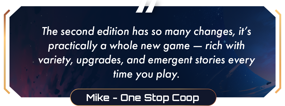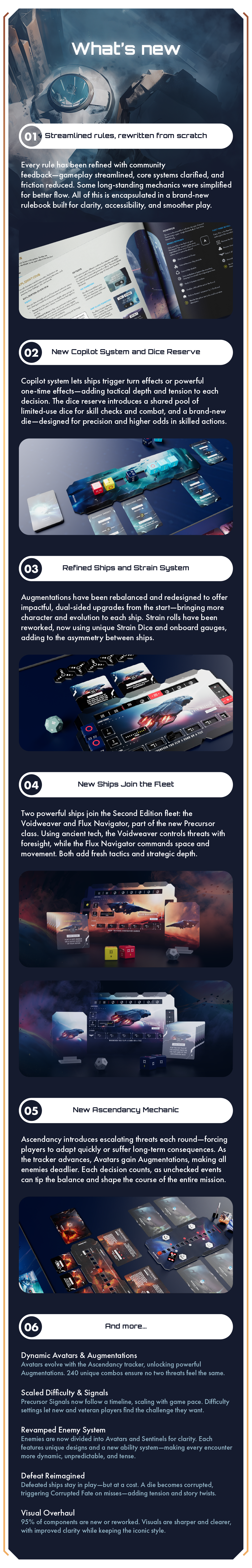 Во второй редакции вас ждут переписанные правила, обновленные корабли и механика напряжения, новые механики совместного пилотирования, резерва кубиков и восхождения. А также варьирующиеся уровни сложности, переделанные враги и Аватары, и новый графический дизайн.