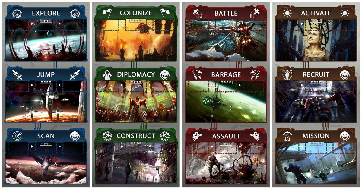 Всего действий 11: исследование, прыжок, сканирование, колонизация, дипломатия, конструирование, бой, обстрел, штурм, активация и найм.