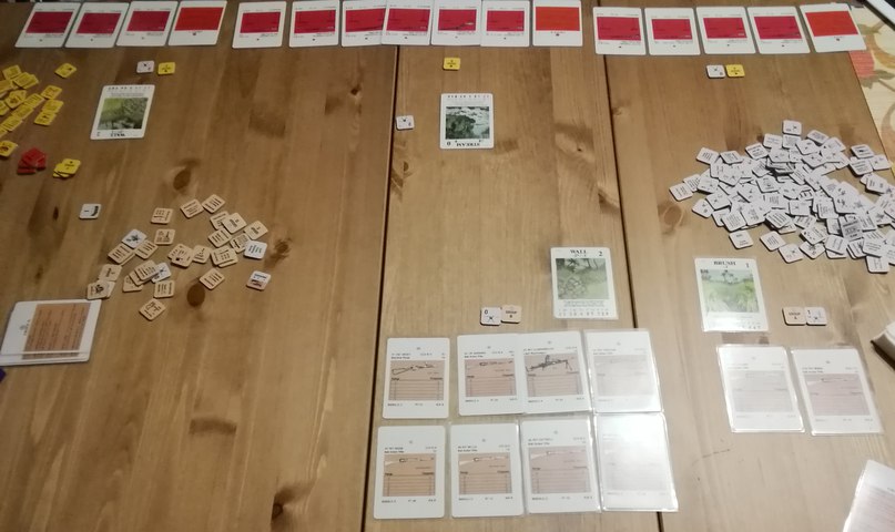 Но в целом я пока не очень убежден в ценности данного расширения. “Парашютисты” могут играться и из базовой игры, другие два сыгранных сценария представляют собой “эхо” сценариев тоже из базовой игры. Джунгли тоже смотрятся достаточно абстрактно, несмотря на атмосферный арт карточек местности. Отдельного минуса заслуживает идея печатать японские карточки черным по красному. Видно крайне неважно. Даже пришлось положить рядом маркеры вооружения, которые Роман предусмотрительно заказал в японских АСЛ-цветах.