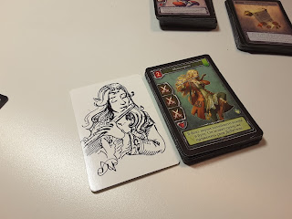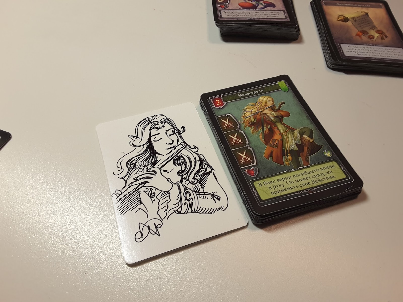 Дальше по мере открытия коробки я последовательно узнал. Что правила напечатаны на плотном глянцевом картоне, а игральные поля (двусторонее - стратегическая карта и односторонне для празрешения боёв) - на картоне той же толщины только матовом. Что резинки на картах не выдержали, и карты пустились болтаться по коробке самостоятельно, попутно раскрыв зиплок с жетонами, освободив и их. Что на картах есть заусенчики вырубки. Что жетоны вырублены не столь красиво, как смотрятся на фотографиях. И какой рисунок-автограф достался мне. Всё это представлено на дальнейших снимках.