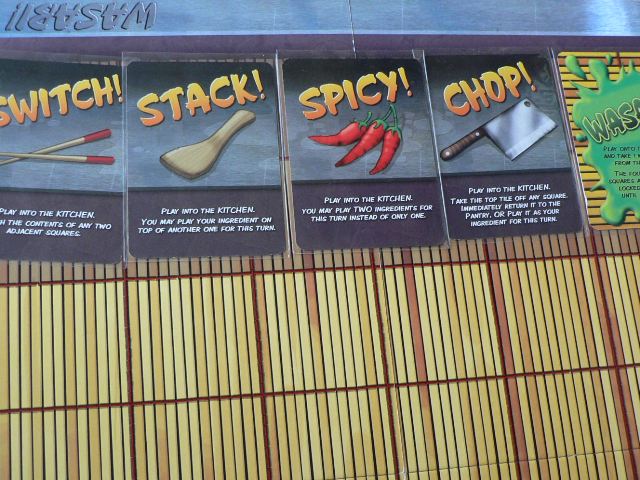 Карты действий - арсенал шефа. Их можно добыть только усердным трудом. В свою очередь они дают возможность сыграть два тайла за один ход, поменять местами ингредиенты на поле, убрать лишний продукт на склад или выложить новый тайл поверх любого другого.