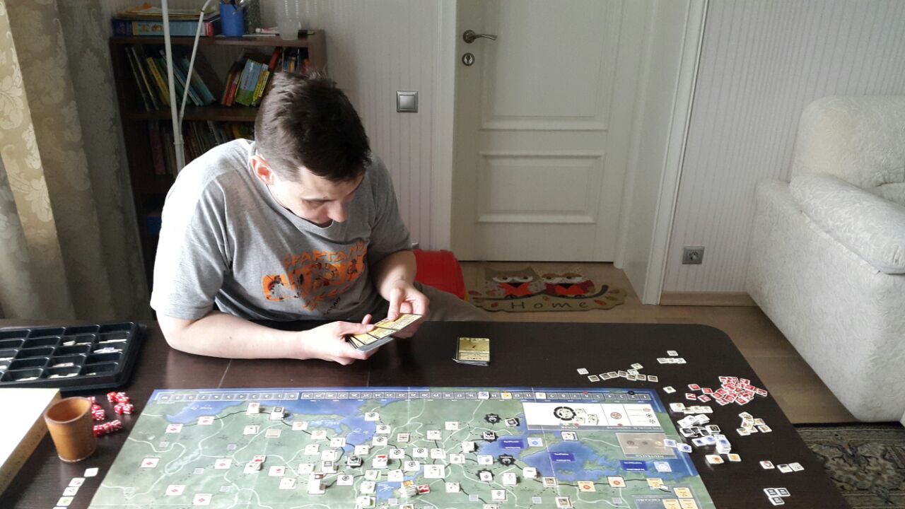 В нашей игре было много интересных моментов. Начиная с того, что анти-Ода (то есть мы) забыли укрепить столицу клана Азаи, и она была захвачена в первый же ход. Это как раз и был один из замков, которые нужны клану Ода для победы. Потом Илья удачно сыграл карту, выводящую мощный клан боевых монахов из игры - они теряют способность восстанавливать войска после битв. Мы же с Женькой, не подумав, атаковали ими большую армию противника, и проиграли, после чего монахи как боевая сила перестали существовать.