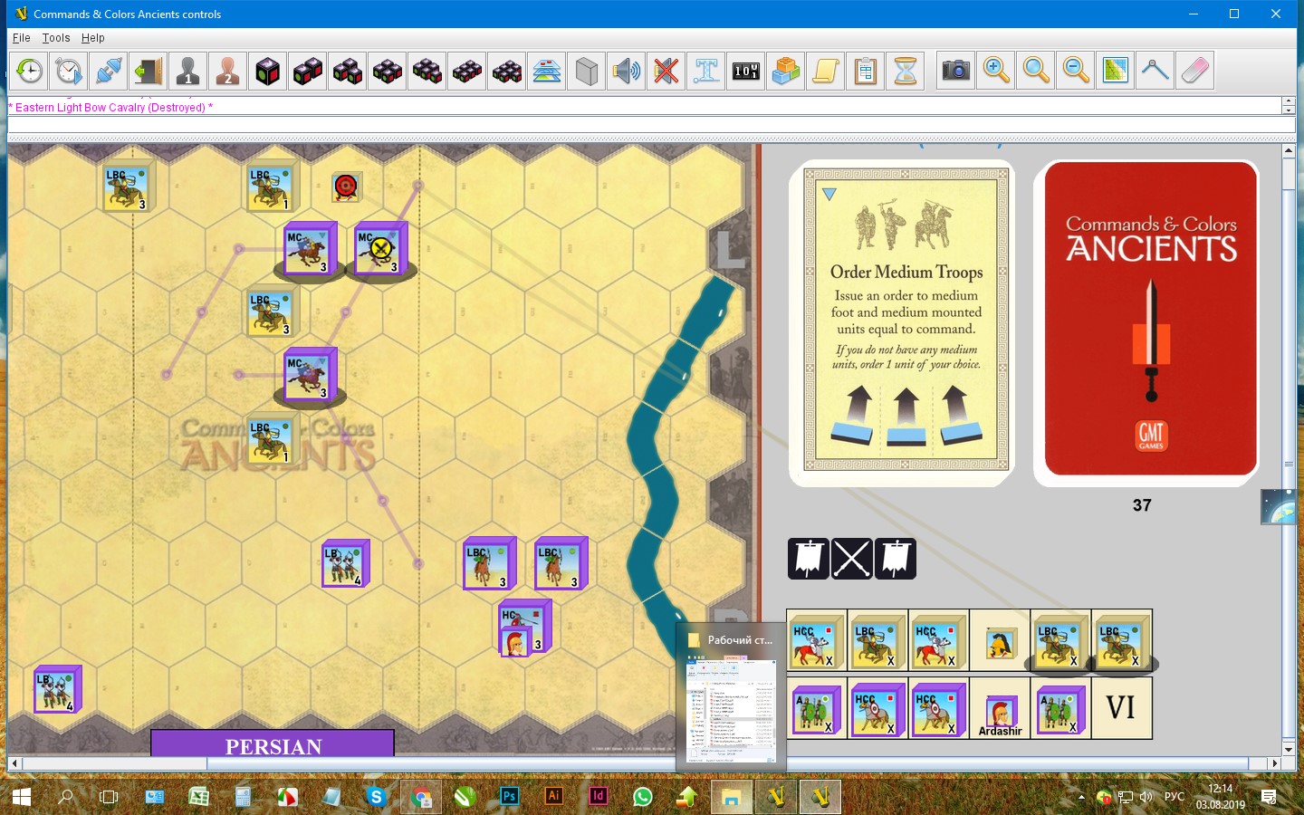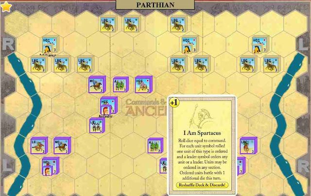 Игра 2Вторая игра началась зеркально: теперь противник, играющий за персов, двинул вперёд свою пехоту и тяжёлую кавалерию. Тут я решил сыграть рискованно и разыграл карту "Я Спартак!" которая позволяет активизировать те отряды, которые выпадут на кубиках.