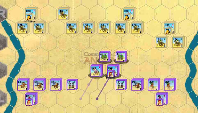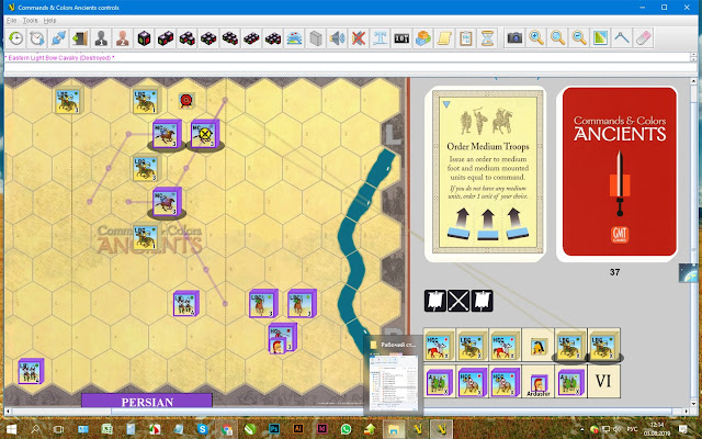 Сценарий этот почти полностью конный. Я не очень люблю такие сценарии: в Античности кавалерия очень слабая, и кавалерийские сражения превращаются в рулетку. Любая атака может привести как к уничтожению противника, так и к полному уничтожению атакующего отряда. Поэтому я решил не мудрить во время игры, а просто играть для удовольствия - атакуя без оглядки на турнирную таблицу, получаемые очки и т.п. И как ни странно, одержал победы в в обеих играх. Хотя всё, на мой взгляд, решал случай: и в первом, и во втором сценариях я мог с лёгкостью проиграть.