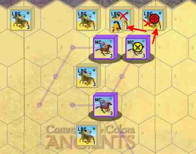 Наступление это оказалось очень неудачным. Через два ходя я потерял все эти силы (и лидера!), уничтожив при этом лишь одну вражескую тяжёлую кавалерию (счёт 1-5).