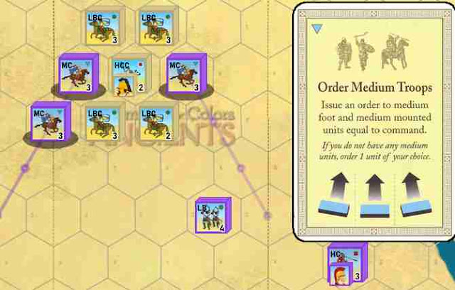 Это всегда риск - можно выбросить мечи, или войска, которых у вас нет. Но зато те войска, которые активизируются, дерутся с дополнительным кубиком атаки. Мне повезло - я смог активизировать две тяжёлые кавалерии и одну лёгкую, которая перекрыла пути отхода одному из вражеских отрядов.