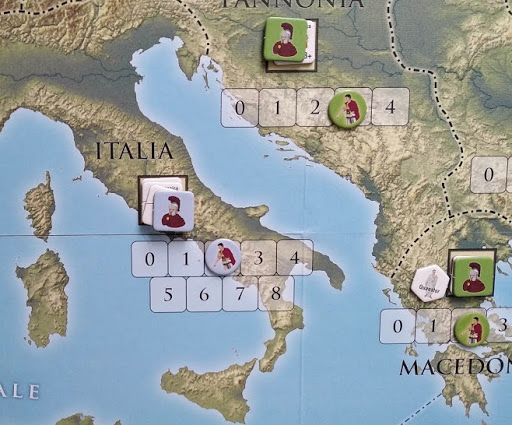 уже есть и занимают около 10 страничек с картинками и примерами игровых ситуаций). Но одновременно элементы игры так связаны друг с другом, что их взаимодействие вызывает ощущение реалистичности встающих перед игроком проблем. Например, если вы вторглись своей армией в провинцию соперника, то вы можете его разбить, но установить свою политическую власт не можете, вам нужно провести это решение через Сенат (сыграть соответсувующую карту и бросить кубик). Да, присутствие вашей армии в провинции сильно облегчает это и даже делает иногда процедуру формальной, и всё равно, надо сыграть карту с политическими очками. То есть вы должны совместно продумывать как военные, так и политические действия, а ещё и общественные, которые повышают вашу поддержку в провинциях и позволяют строить улушения.