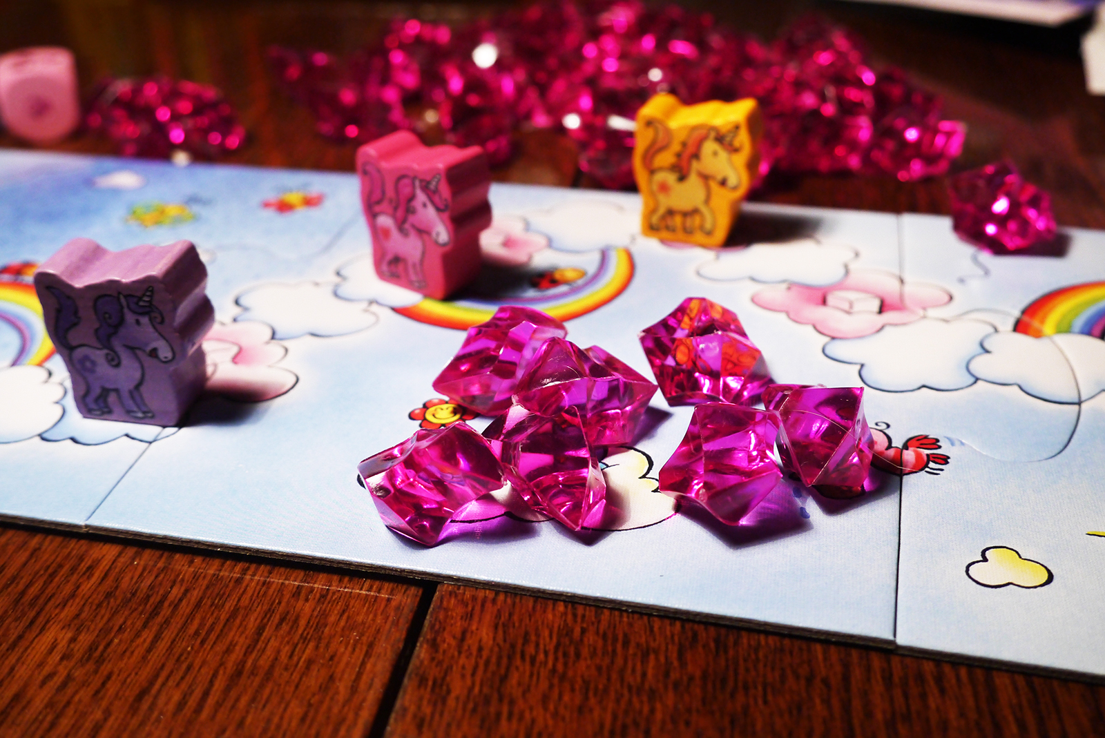 Так как игра расчитана на детей от 3 лет, то и правила ожидаемо просты: бросаем кубик облаков, передвигаемся на выпавшее количество. Если выпадает пироженка - стоим на месте, "кушаем". Попав на облако с радугой, скатываемся по ней вперёд. Розовое облако позволяет при попадании бросить кубик кристаллов и заполучить столько, сколько выпало. Фиолетовое облако позволяет сделать подарок другому игроку в виде одного кристалла из общей кучки. Игра заканчивается, когда кто-то добрался до финиша, но побеждает тот, кто накопил больше кристаллов.