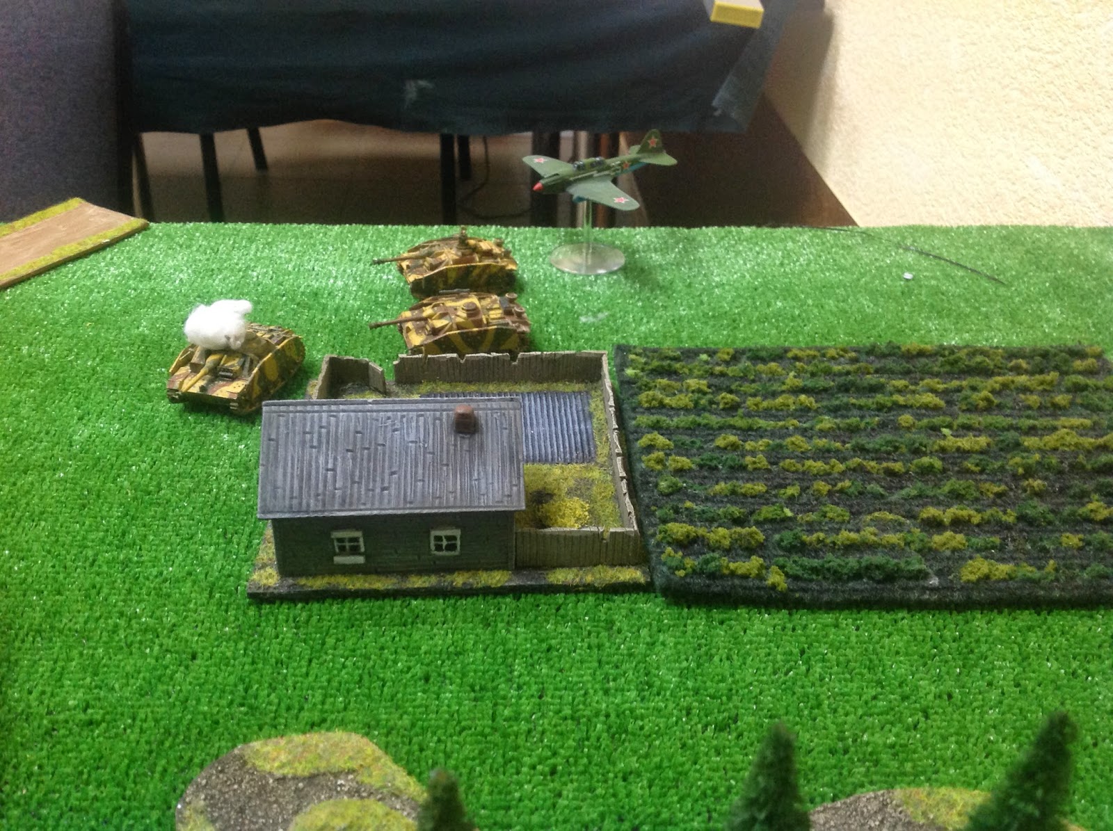 Советский игрок сильно понадеялся на то что немецкая авиация не сможет прилететь в свой ход, и как следствие не стал рассредотачивать свои танки. Как оказалось в дальнейшем это было ошибкой чуть было не стоявшей срыва всего наступления. Немец на 3 кубах выкинул пятёрку. А в броске на количество самолётов выкинул шесть. Естественно немецкая авиация была нацелена на столь удачно сгруппировавшийся в одном месте взвод танков ИС-2. Благо мощности пушек Hs 129B3, хватало для прошива боковой брони советских монстров...да так что никакая АТ (спасбросок после попадания) бы не спасла.